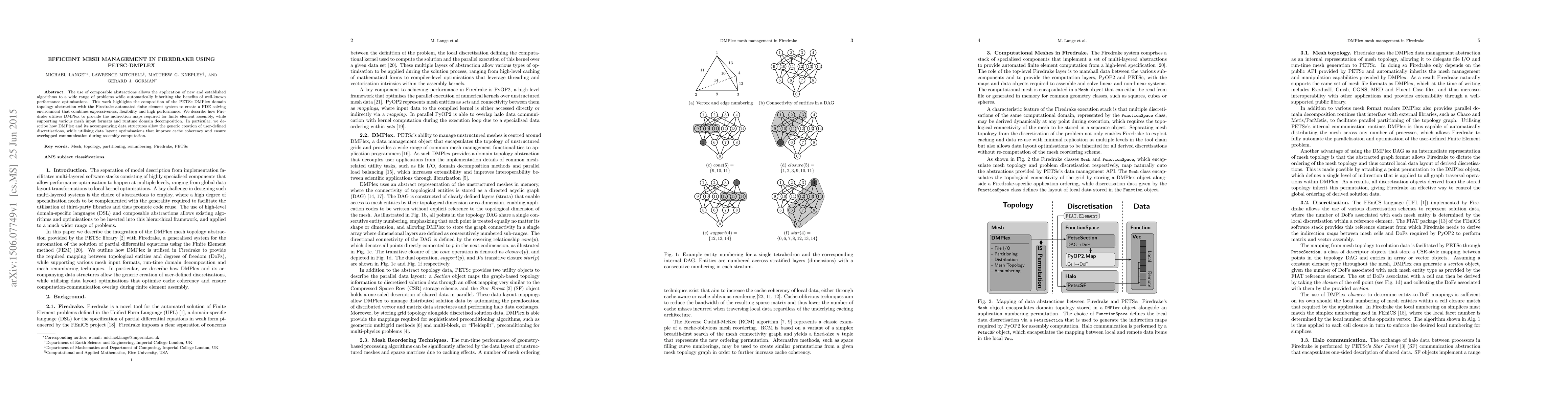 This paper explores the integration of PETSc's DMPlex with Firedrake to create a high-performance PDE solver, leveraging composable abstractions for flexible and efficient mesh management, and optimizing data layout for improved cache coherency and communication overlap.