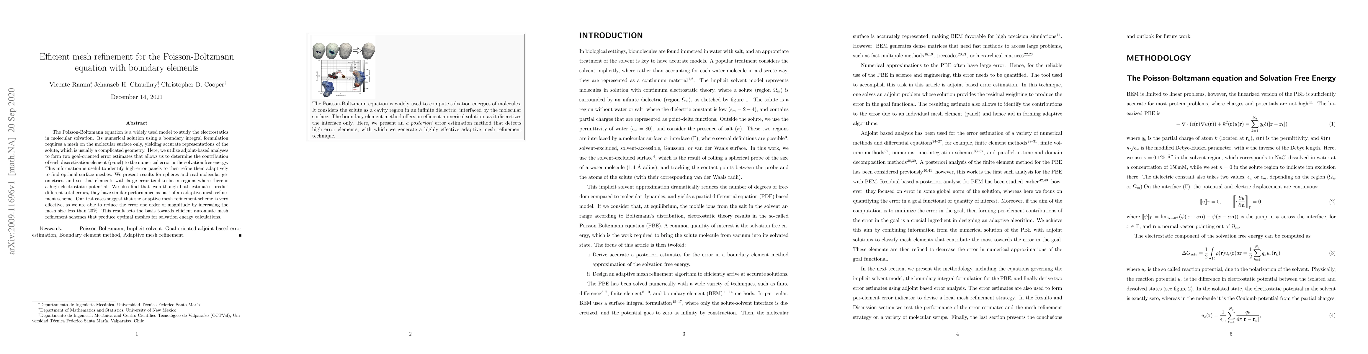 This paper proposes an adaptive mesh refinement technique for solving the Poisson-Boltzmann equation using boundary elements, employing adjoint-based error estimates to identify high-error regions and refine them. The method effectively reduces error by a factor of ten with minimal mesh size increase, demonstrating potential for optimal mesh generation in solvation energy calculations.