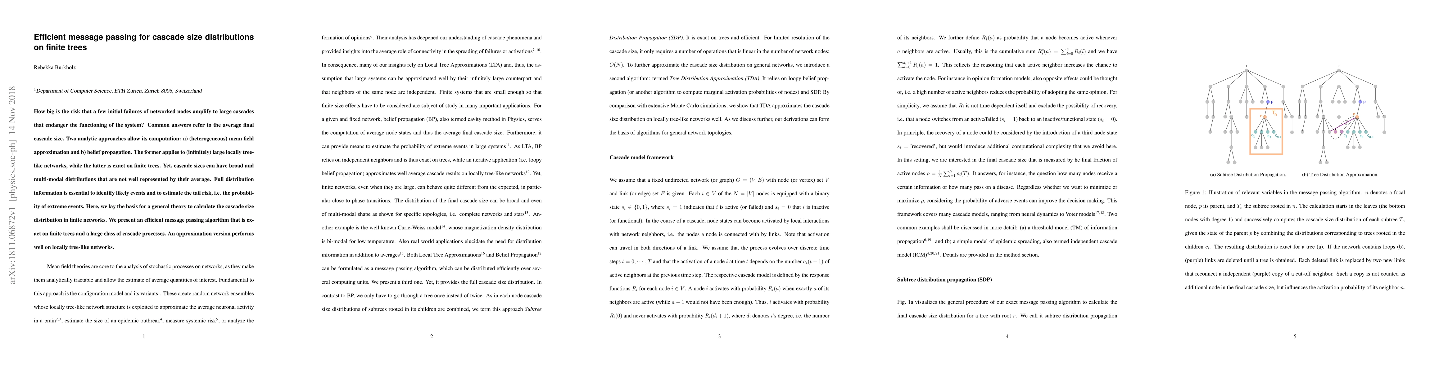 How big is the risk that a few initial failures of networked nodes amplify to large cascades that endanger the functioning of the system? Common answers refer to the average final cascade size. Two analytic approaches allow its computation: a) (heterogeneous) mean field approximation and b) belief propagation. The former applies to (infinitely) large locally tree-like networks, while the latter is exact on finite trees. Yet, cascade sizes can have broad and multi-modal distributions that are not well represented by their average. Full distribution information is essential to identify likely events and to estimate the tail risk, i.e. the probability of extreme events. Here, we lay the basis for a general theory to calculate the cascade size distribution in finite networks. We present an efficient message passing algorithm that is exact on finite trees and a large class of cascade processes. An approximation version performs well on locally tree-like networks.
