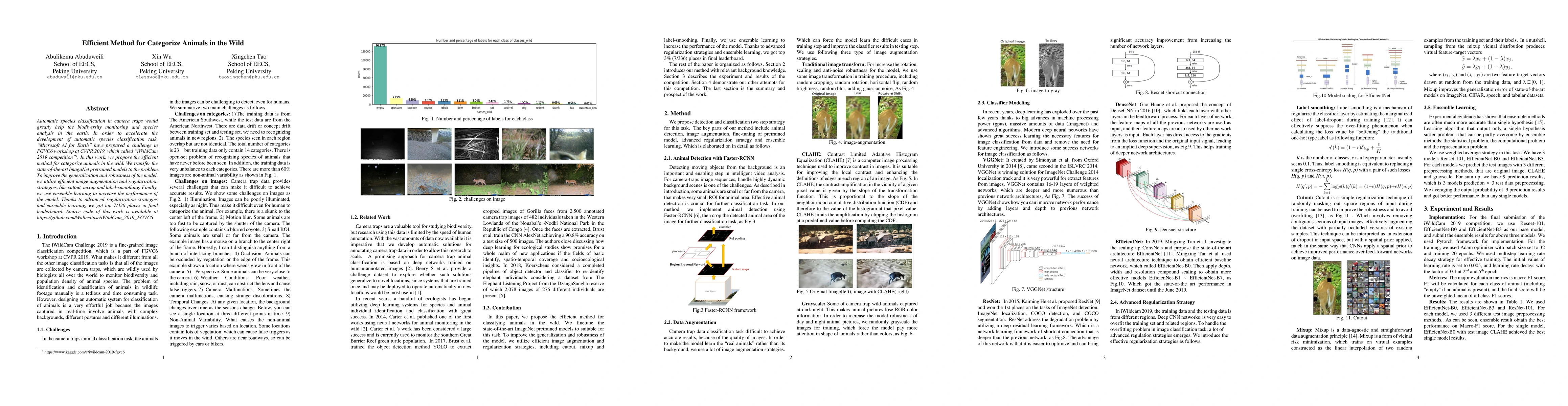 Automatic species classification in camera traps would greatly help the biodiversity monitoring and species analysis in the earth. In order to accelerate the development of automatic species classification task, "Microsoft AI for Earth" have prepared a challenge in FGVC6 workshop at CVPR 2019, which called "iWildCam 2019 competition". In this work, we propose an efficient method for categorizing animals in the wild. We transfer the state-of-the-art ImagaNet pretrained models to the problem. To improve the generalization and robustness of the model, we utilize efficient image augmentation and regularization strategies, like cutout, mixup and label-smoothing. Finally, we use ensemble learning to increase the performance of the model. Thanks to advanced regularization strategies and ensemble learning, we got top 7/336 places in the final leaderboard. Source code of this work is available at https://github.com/Walleclipse/iWildCam_2019_FGVC6