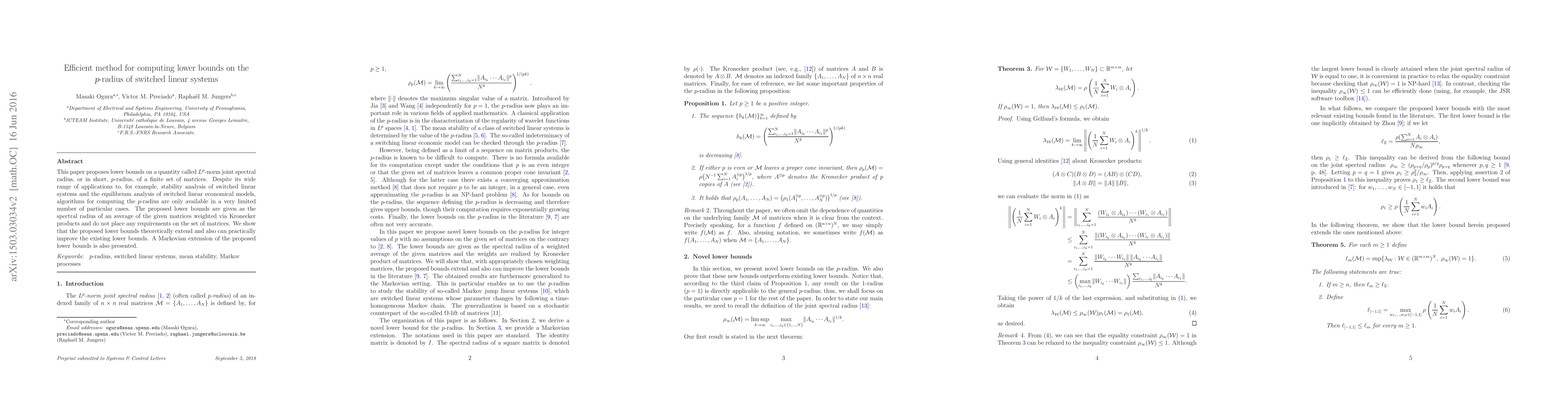 This paper introduces efficient lower bounds for computing the $p$-radius of switched linear systems, given as the spectral radius of an average matrix formed via Kronecker products. The proposed method extends existing theoretical and practical lower bounds and includes a Markovian extension.