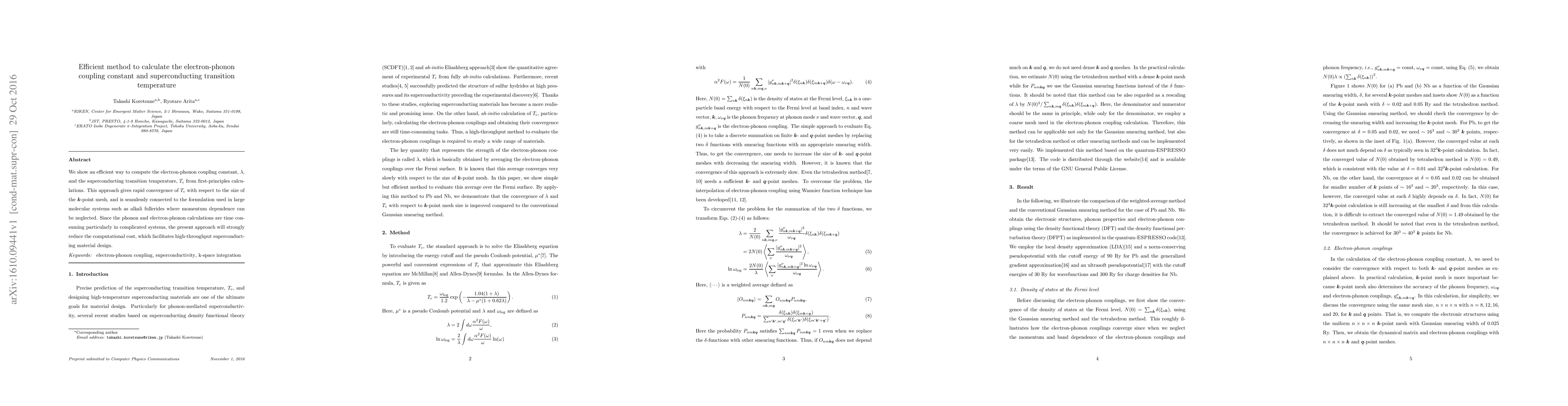 This paper presents an efficient method for calculating the electron-phonon coupling constant and superconducting transition temperature from first-principles. The approach rapidly converges Tc with minimal computational cost, enabling high-throughput material design for superconductors.