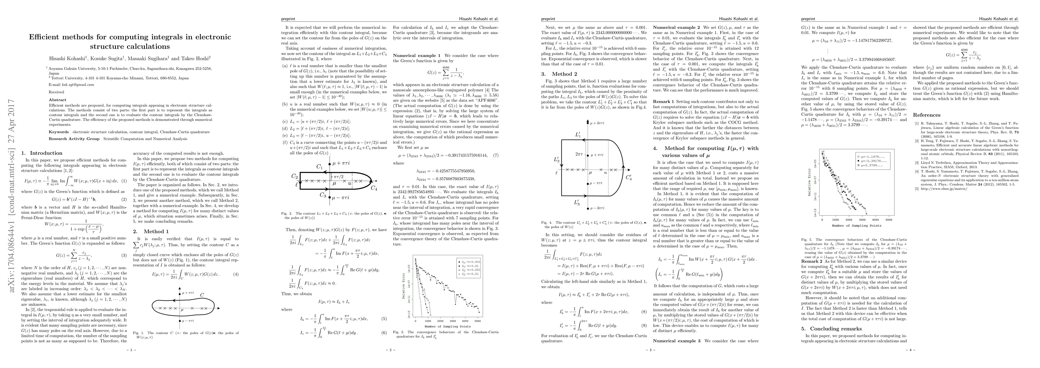 Summary: This paper proposes efficient methods for computing integrals in electronic structure calculations, utilizing contour integral representation and Clenshaw-Curtis quadrature for evaluation, and demonstrates their efficiency via numerical experiments.