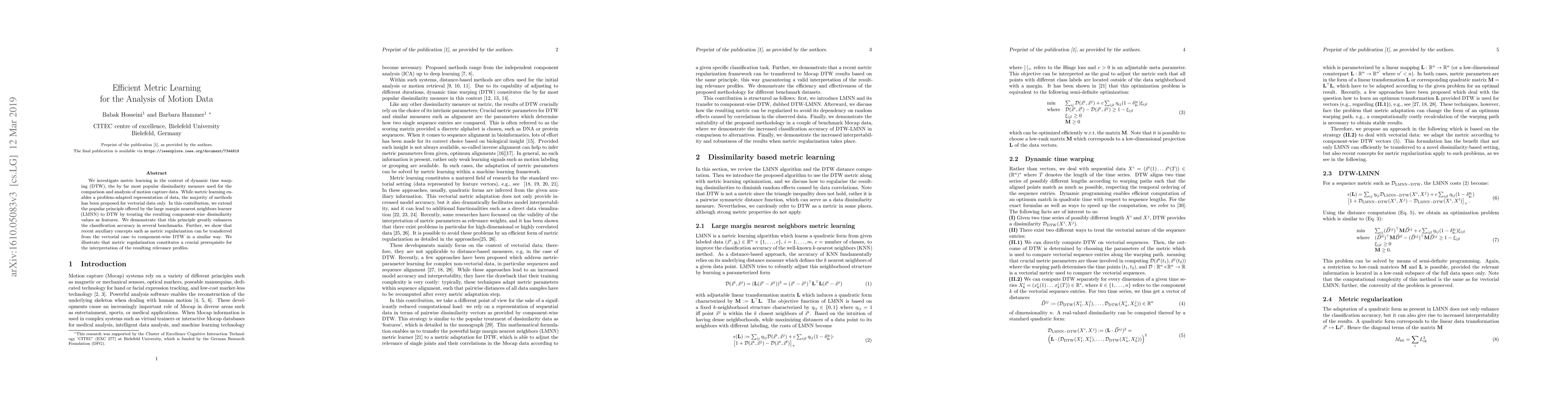 We investigate metric learning in the context of dynamic time warping (DTW), the by far most popular dissimilarity measure used for the comparison and analysis of motion capture data. While metric learning enables a problem-adapted representation of data, the majority of methods has been proposed for vectorial data only. In this contribution, we extend the popular principle offered by the large margin nearest neighbors learner (LMNN) to DTW by treating the resulting component-wise dissimilarity values as features. We demonstrate that this principle greatly enhances the classification accuracy in several benchmarks. Further, we show that recent auxiliary concepts such as metric regularization can be transferred from the vectorial case to component-wise DTW in a similar way. We illustrate that metric regularization constitutes a crucial prerequisite for the interpretation of the resulting relevance profiles.