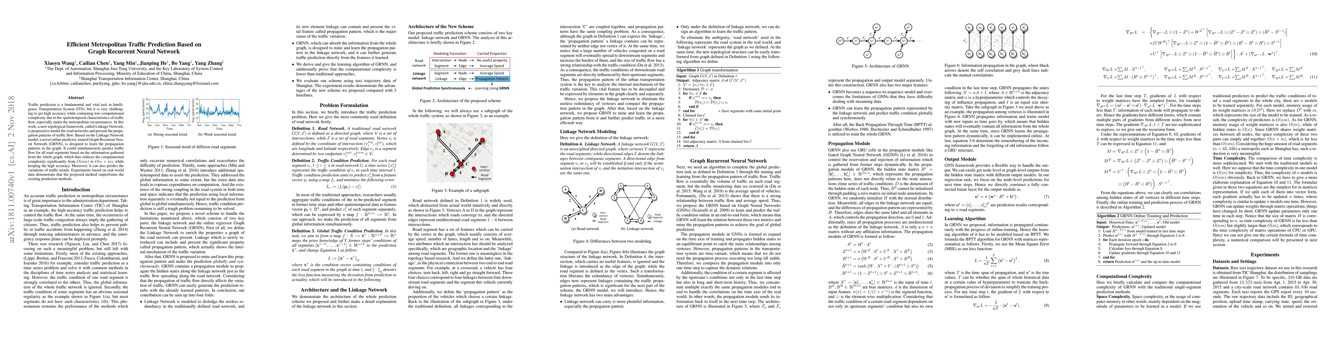 This paper proposes a Linkage Network model to represent metropolitan road networks and introduces a Graph Recurrent Neural Network (GRNN) for efficient traffic flow prediction. The method reduces computational complexity while maintaining high accuracy, outperforming existing methods based on real-world data.