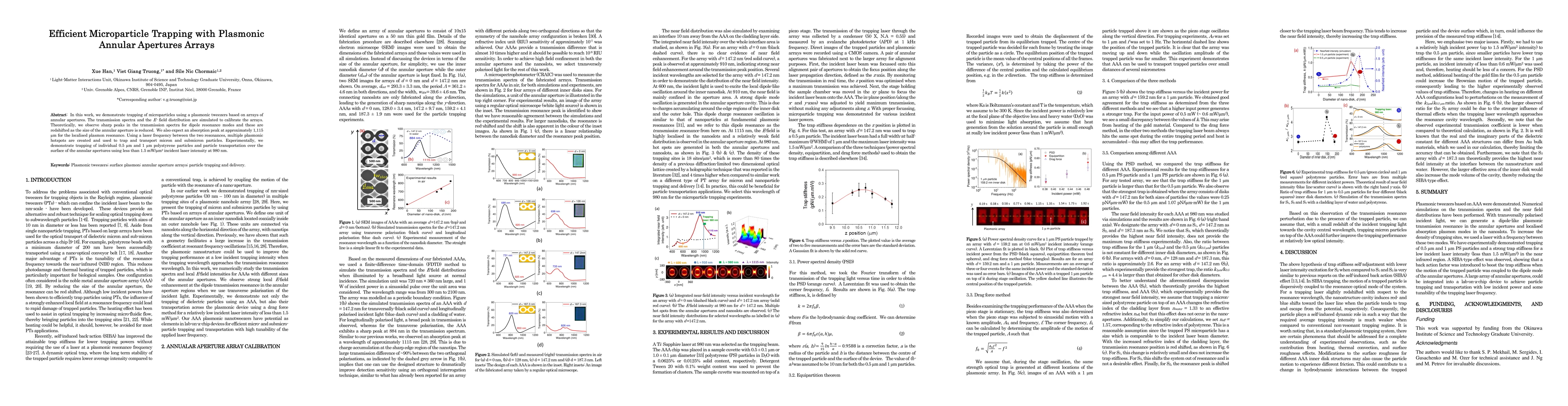 This research demonstrates trapping of microparticles using plasmonic tweezers based on arrays of annular apertures. Simulations reveal sharp transmission peaks for dipole resonance, enabling the trapping of micron and submicron particles at a laser frequency between these resonances, with successful trapping of 0.5 µm and 1 µm polystyrene particles achieved at low laser intensities.
