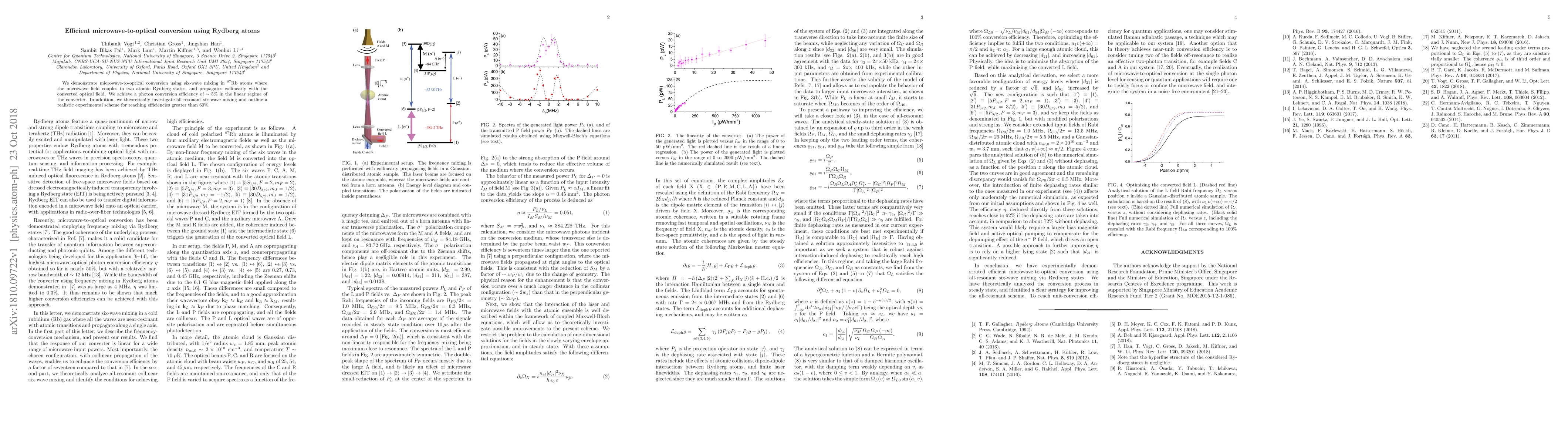 We demonstrate microwave-to-optical conversion using six-wave mixing in $^{87}$Rb atoms where the microwave field couples to two atomic Rydberg states, and propagates collinearly with the converted optical field. We achieve a photon conversion efficiency of ~5% in the linear regime of the converter. In addition, we theoretically investigate all-resonant six-wave mixing and outline a realistic experimental scheme for reaching efficiencies greater than 60%.