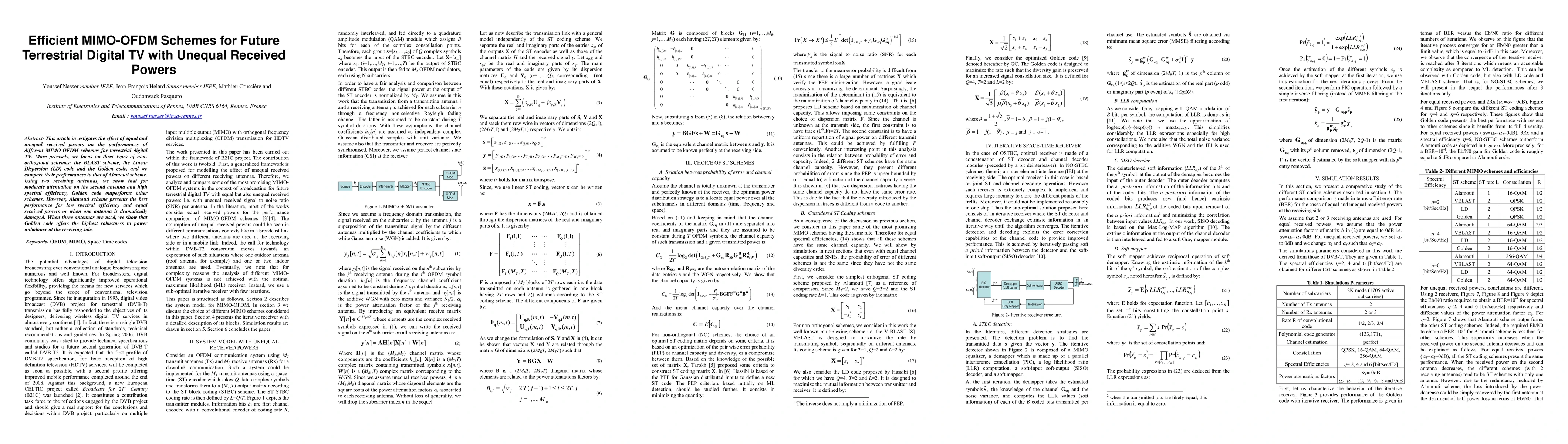 The paper investigates the performance of MIMO-OFDM schemes for future terrestrial digital TV under conditions of unequal received powers, using an iterative receiver and comparing Alamouti, V-BLAST, LD, and Golden codes.