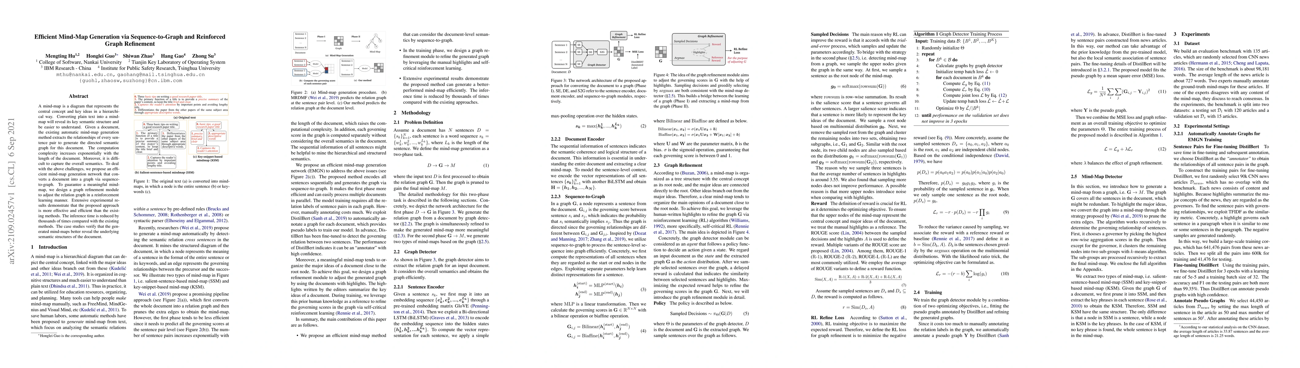 This paper proposes an efficient mind-map generation network using sequence-to-graph conversion and reinforced graph refinement to convert documents into hierarchical semantic structures. The method significantly reduces computation time and better captures the document's overall semantics compared to existing methods.