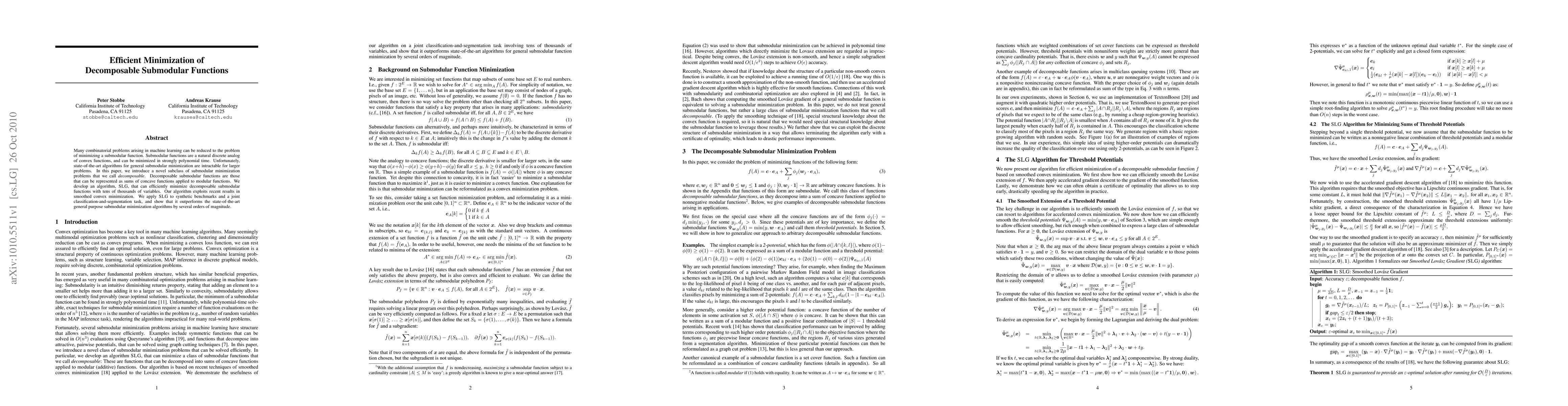This paper introduces a novel algorithm, SLG, for efficiently minimizing decomposable submodular functions, which are a subclass of submodular functions that can be represented as sums of concave functions applied to modular functions. The proposed method outperforms existing general submodular minimization algorithms significantly on both synthetic benchmarks and a joint classification-and-segmentation task.