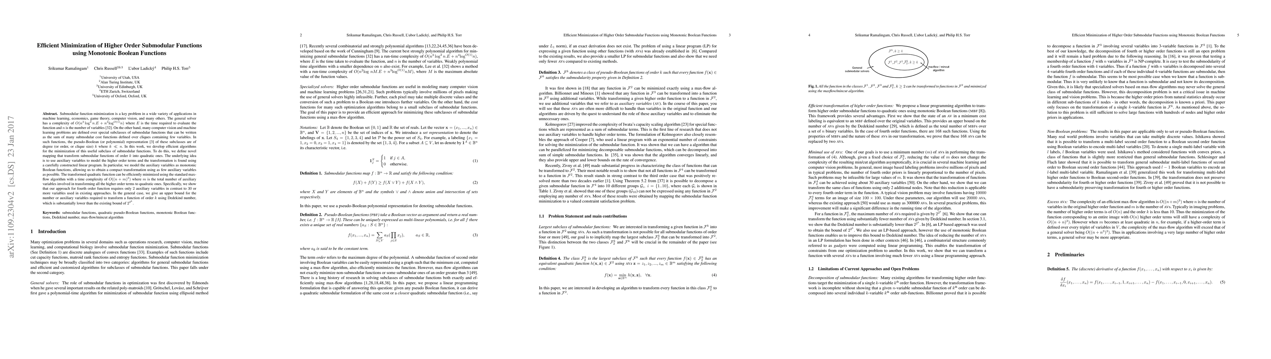 This paper presents efficient algorithms for minimizing higher order submodular functions by transforming them into quadratic forms using monotonic Boolean functions. The proposed method leverages auxiliary variables to model higher order terms, achieving a compact transformation through a carefully constructed linear program.