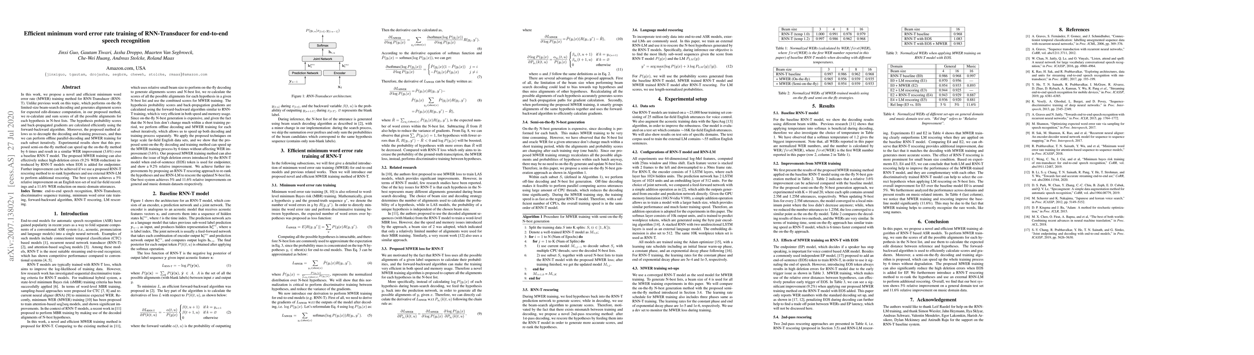 This paper proposes an efficient MWER training method for RNN-Transducer models, speeding up the training process by decoupling decoding and training, and achieving up to 6x faster computation with a similar WER improvement compared to baseline models. The best system shows a 5% relative WER improvement on real far-field recordings and a 11.6% reduction on music-domain utterances.