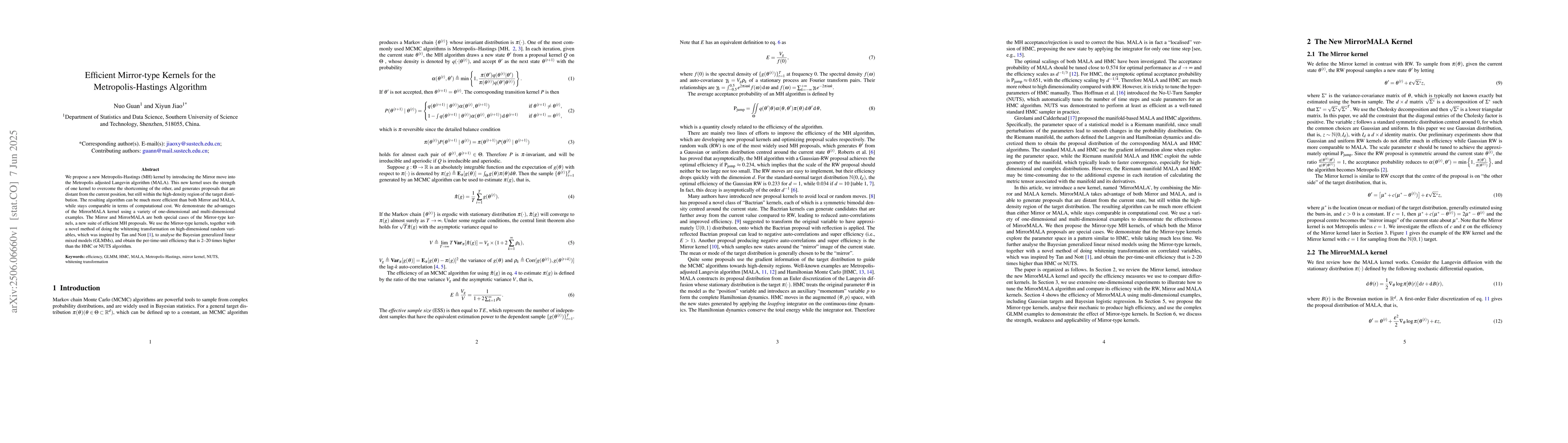 A new Metropolis-Hastings algorithm is proposed, combining the strengths of Mirror and MALA kernels to achieve higher efficiency while maintaining comparable computational cost. The resulting algorithm shows significant improvements over existing methods in one- and multi-dimensional examples.