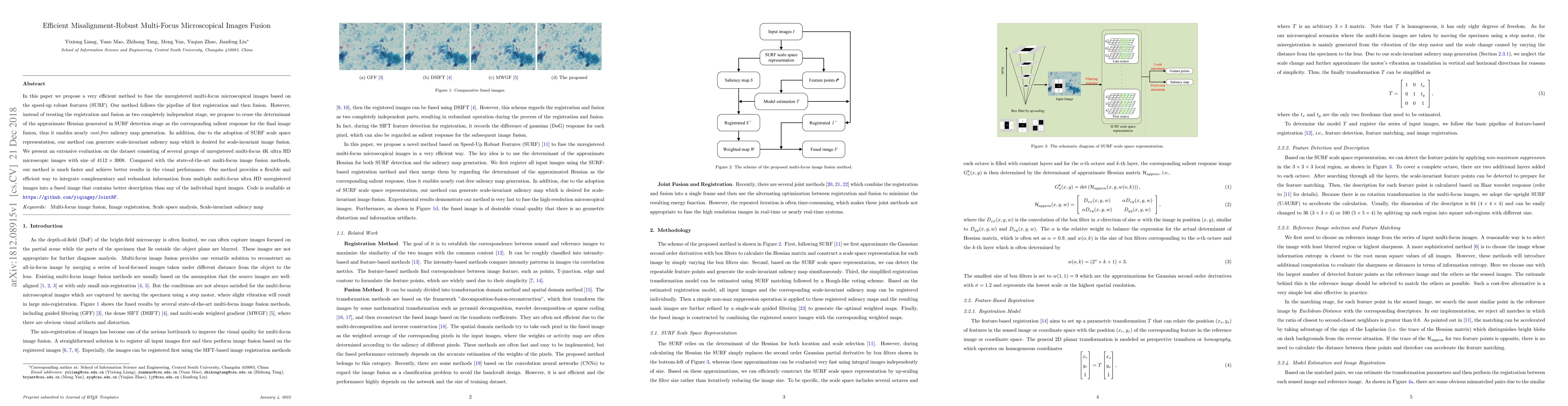 In this paper we propose a very efficient method to fuse the unregistered multi-focus microscopical images based on the speed-up robust features (SURF). Our method follows the pipeline of first registration and then fusion. However, instead of treating the registration and fusion as two completely independent stage, we propose to reuse the determinant of the approximate Hessian generated in SURF detection stage as the corresponding salient response for the final image fusion, thus it enables nearly cost-free saliency map generation. In addition, due to the adoption of SURF scale space representation, our method can generate scale-invariant saliency map which is desired for scale-invariant image fusion. We present an extensive evaluation on the dataset consisting of several groups of unregistered multi-focus 4K ultra HD microscopic images with size of 4112 x 3008. Compared with the state-of-the-art multi-focus image fusion methods, our method is much faster and achieve better results in the visual performance. Our method provides a flexible and efficient way to integrate complementary and redundant information from multiple multi-focus ultra HD unregistered images into a fused image that contains better description than any of the individual input images. Code is available at https://github.com/yiqingmy/JointRF.