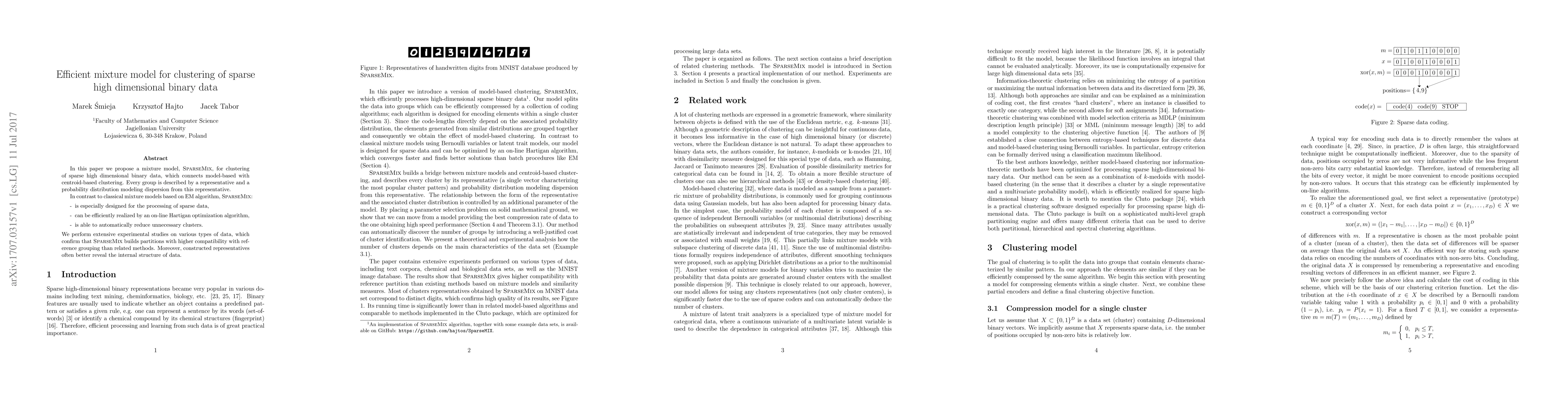 Summary: SparseMix is a novel mixture model designed for clustering sparse high-dimensional binary data, combining model-based and centroid-based clustering. It efficiently processes sparse data using an online Hartigan optimization algorithm, automatically reducing unnecessary clusters, and outperforms related methods in experimental studies.