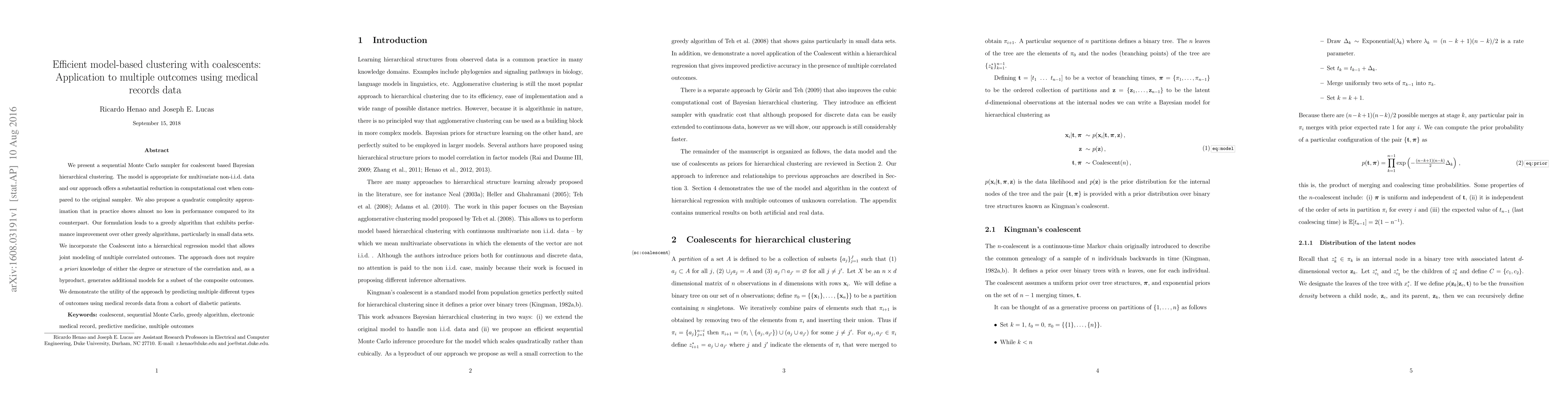 This paper introduces a computationally efficient model-based clustering method using coalescent-based Bayesian hierarchical clustering, significantly reducing computational costs. It also demonstrates the method's effectiveness in joint modeling of multiple correlated outcomes in medical records data, particularly for diabetic patients.