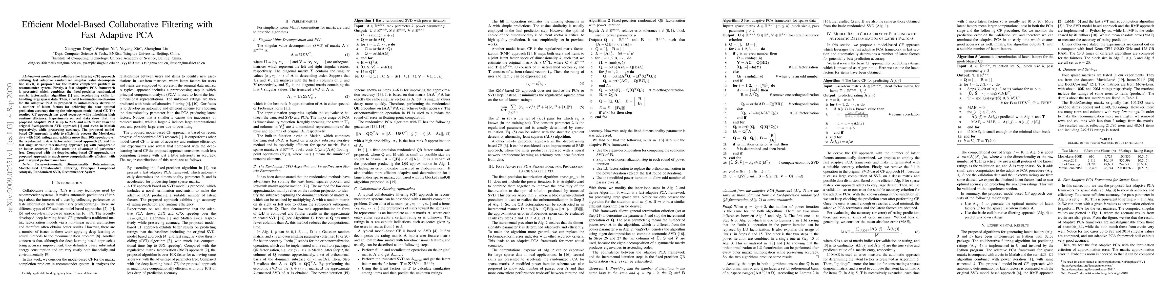 A model-based collaborative filtering (CF) approach utilizing fast adaptive randomized singular value decomposition (SVD) is proposed for the matrix completion problem in recommender system. Firstly, a fast adaptive PCA frameworkis presented which combines the fixed-precision randomized matrix factorization algorithm [1] and accelerating skills for handling large sparse data. Then, a novel termination mechanism for the adaptive PCA is proposed to automatically determine a number of latent factors for achieving the near optimal prediction accuracy during the subsequent model-based CF. The resulted CF approach has good accuracy while inheriting high runtime efficiency. Experiments on real data show that, the proposed adaptive PCA is up to 2.7X and 6.7X faster than the original fixed-precision SVD approach [1] and svds in Matlab repsectively, while preserving accuracy. The proposed model-based CF approach is able to efficiently process the MovieLens data with 20M ratings and exhibits more than 10X speedup over the regularized matrix factorization based approach [2] and the fast singular value thresholding approach [3] with comparable or better accuracy. It also owns the advantage of parameter free. Compared with the deep-learning-based CF approach, the proposed approach is much more computationally efficient, with just marginal performance loss.