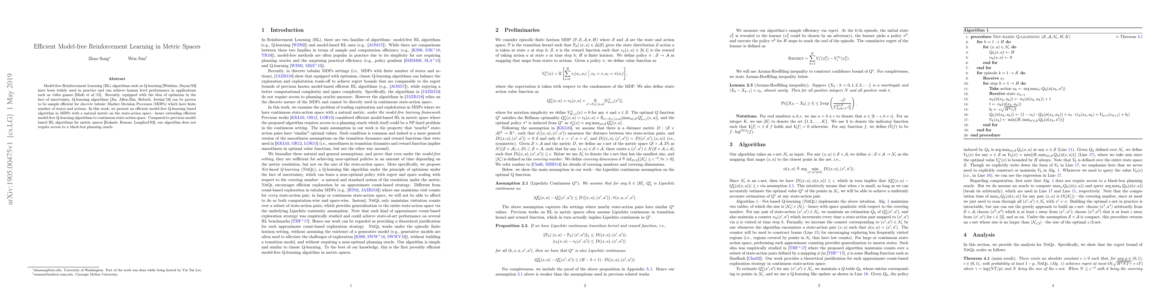 Model-free Reinforcement Learning (RL) algorithms such as Q-learning [Watkins, Dayan 92] have been widely used in practice and can achieve human level performance in applications such as video games [Mnih et al. 15]. Recently, equipped with the idea of optimism in the face of uncertainty, Q-learning algorithms [Jin, Allen-Zhu, Bubeck, Jordan 18] can be proven to be sample efficient for discrete tabular Markov Decision Processes (MDPs) which have finite number of states and actions. In this work, we present an efficient model-free Q-learning based algorithm in MDPs with a natural metric on the state-action space--hence extending efficient model-free Q-learning algorithms to continuous state-action space. Compared to previous model-based RL algorithms for metric spaces [Kakade, Kearns, Langford 03], our algorithm does not require access to a black-box planning oracle.