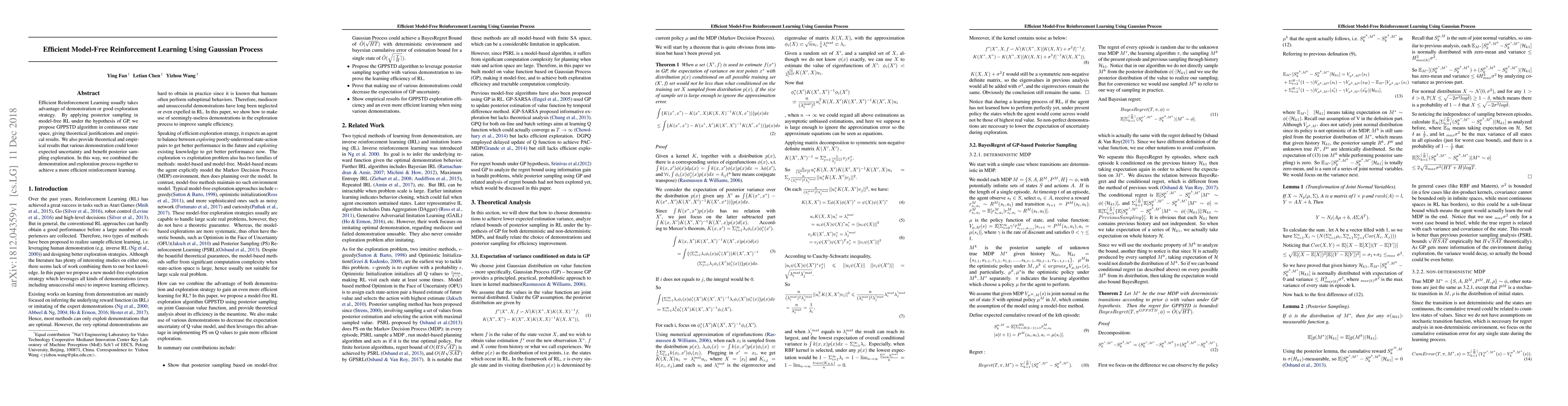 This paper proposes the Gaussian Process Posterior Sampling Reinforcement Learning (GPPSTD) algorithm for efficient model-free reinforcement learning in continuous state spaces, combining demonstration data and exploration to reduce uncertainty and improve learning efficiency. Theoretical justifications and empirical results support the effectiveness of this approach.