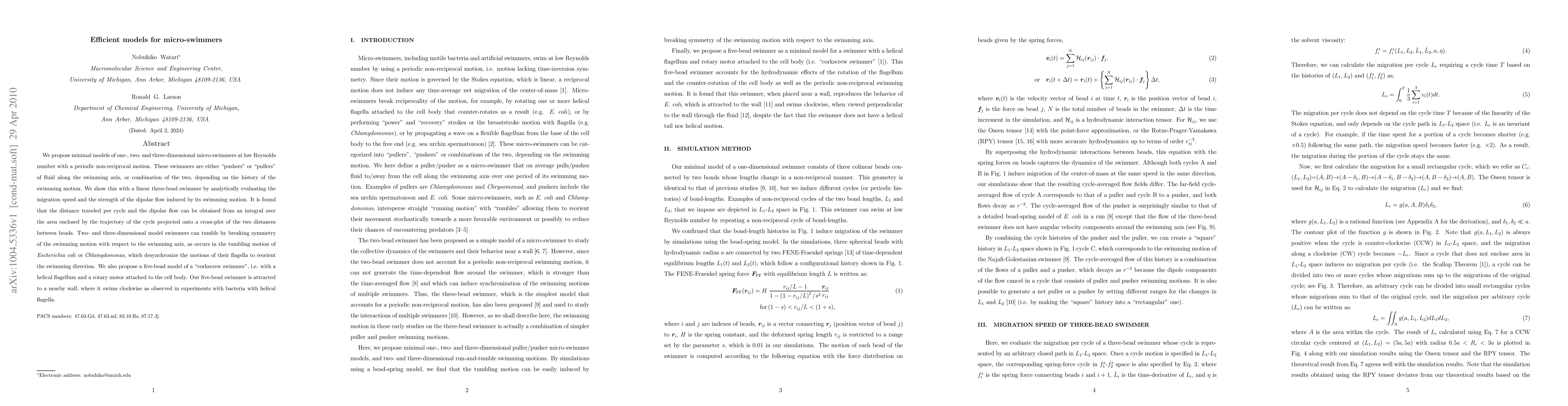We propose minimal models of one-, two- and three-dimensional micro-swimmers at low Reynolds number with a periodic non-reciprocal motion. These swimmers are either "pushers" or "pullers" of fluid along the swimming axis, or combination of the two, depending on the history of the swimming motion. We show this with a linear three-bead swimmer by analytically evaluating the migration speed and the strength of the dipolar flow induced by its swimming motion. It is found that the distance traveled per cycle and the dipolar flow can be obtained from an integral over the area enclosed by the trajectory of the cycle projected onto a cross-plot of the two distances between beads. Two- and three-dimensional model swimmers can tumble by breaking symmetry of the swimming motion with respect to the swimming axis, as occurs in the tumbling motion of Escherichia coli or Chlamydomonas, which desynchronize the motions of their flagella to reorient the swimming direction. We also propose a five-bead model of a "corkscrew swimmer", i.e. with a helical flagellum and a rotary motor attached to the cell body. Our five-bead swimmer is attracted to a nearby wall, where it swims clockwise as observed in experiments with bacteria with helical flagella.