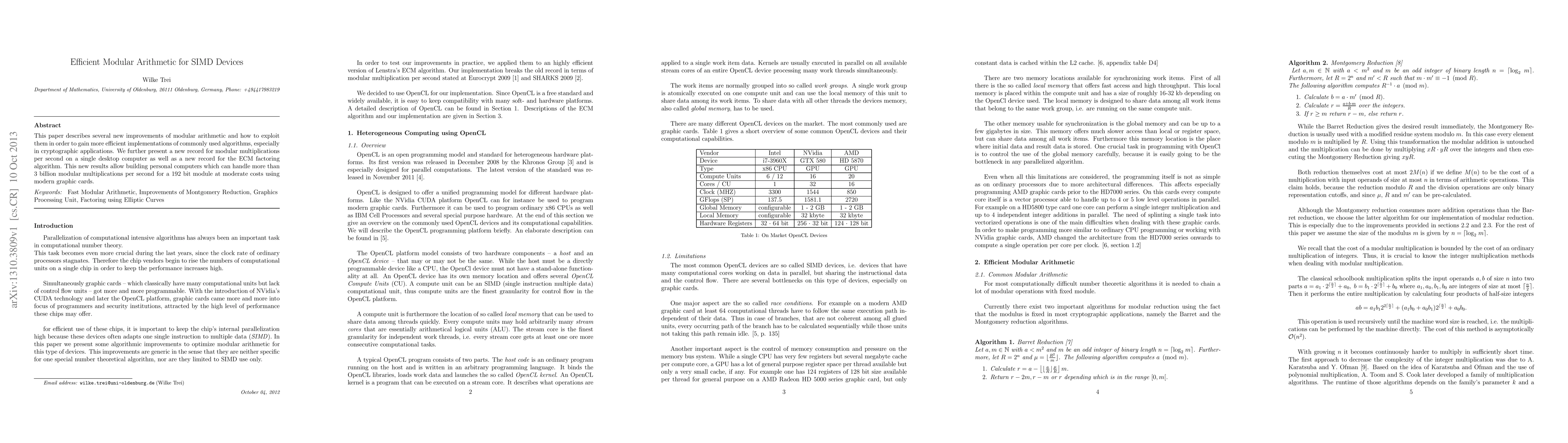 This paper introduces optimized modular arithmetic techniques for SIMD devices, achieving record speeds in modular multiplications and ECM factoring algorithms, enabling affordable PCs to perform over 3 billion modular multiplications per second for 192-bit modules using modern graphics cards.