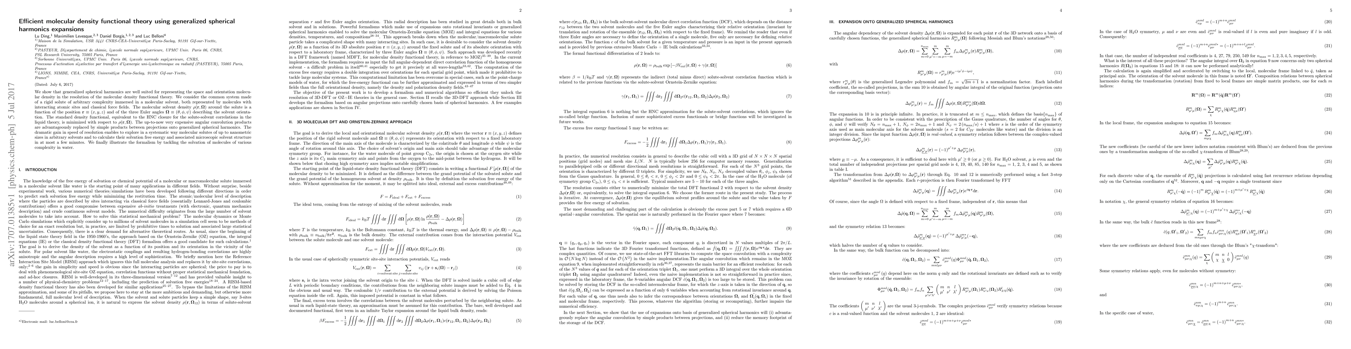 This paper proposes using generalized spherical harmonics to efficiently solve molecular density functional theory, significantly speeding up calculations of solvation free energy and microscopic solvent structures for solutes in various solvents, enabling exploration of nanometric solutes within minutes. The method replaces costly angular convolutions with simpler harmonic projections, demonstrating its effectiveness through examples of complex molecules in water.