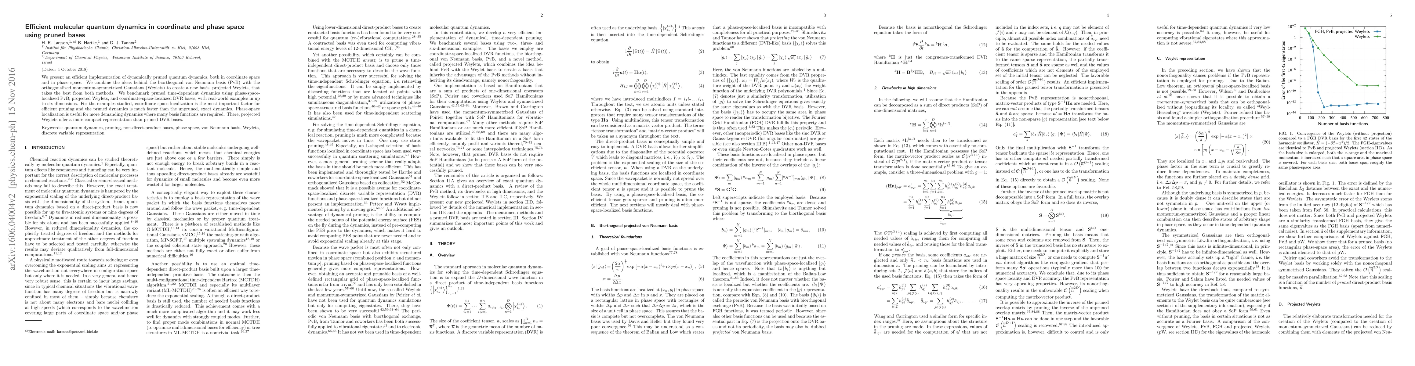 We present an efficient implementation of dynamically pruned quantum dynamics, both in coordinate space and in phase space. We combine the ideas behind the biorthogonal von Neumann basis (PvB) with the orthogonalized momentum-symmetrized Gaussians (Weylets) to create a new basis, projected Weylets, that takes the best from both methods. We benchmark pruned dynamics using phase-space-localized PvB, projected Weylets, and coordinate-space-localized DVR bases, with real-world examples in up to six dimensions. We show that coordinate-space localization is most important for efficient pruning and that pruned dynamics is much faster compared to unpruned, exact dynamics. Phase-space localization is useful for more demanding dynamics where many basis functions are required. There, projected Weylets offer a more compact representation than pruned DVR bases.
