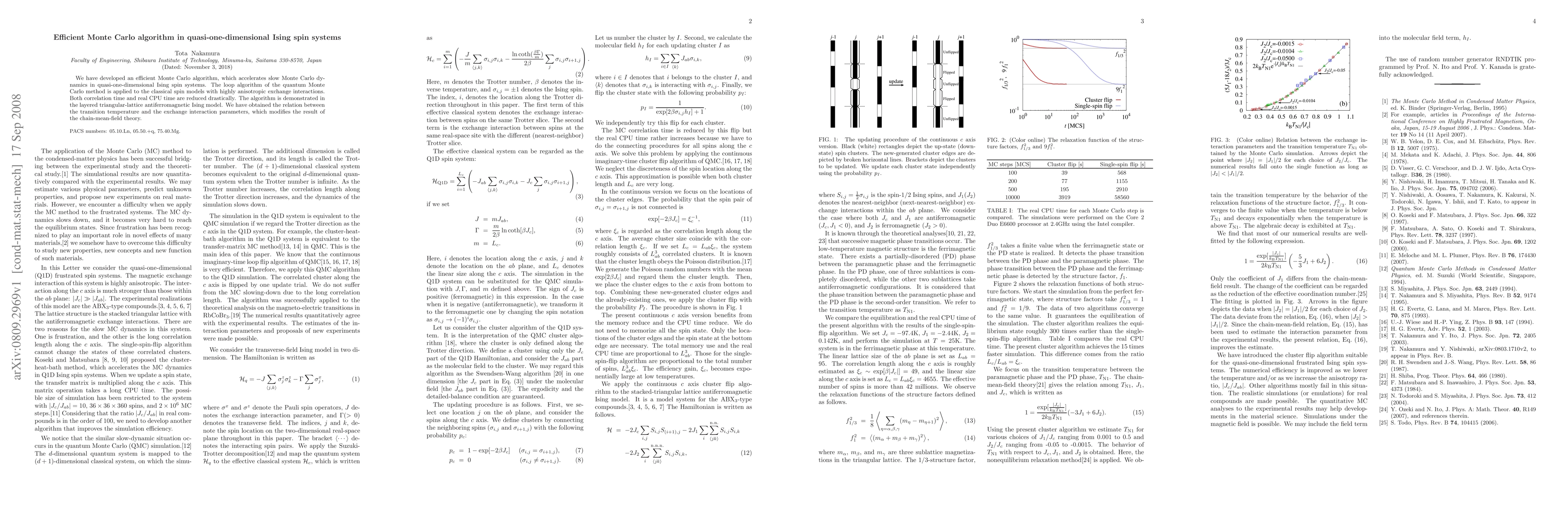 This paper introduces an efficient Monte Carlo algorithm that significantly speeds up dynamics in quasi-one-dimensional Ising spin systems, particularly in layered triangular-lattice antiferromagnetic models, reducing both correlation time and CPU time. The new algorithm modifies previous chain-mean-field theory results for transition temperatures.