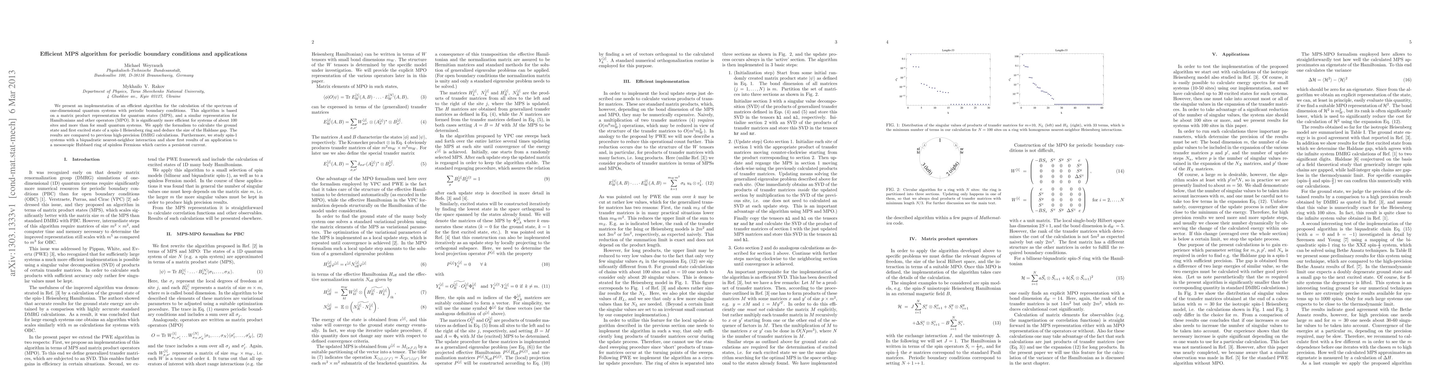 This paper introduces an efficient matrix product state (MPS) algorithm for calculating the spectrum of one-dimensional quantum systems with periodic boundary conditions, demonstrating its effectiveness for systems with over 100 sites. The algorithm is applied to determine the ground state and first excited state of a spin-1 Heisenberg ring, comparing results to high-precision DMRG calculations and exploring its potential in mesoscopic Hubbard rings.