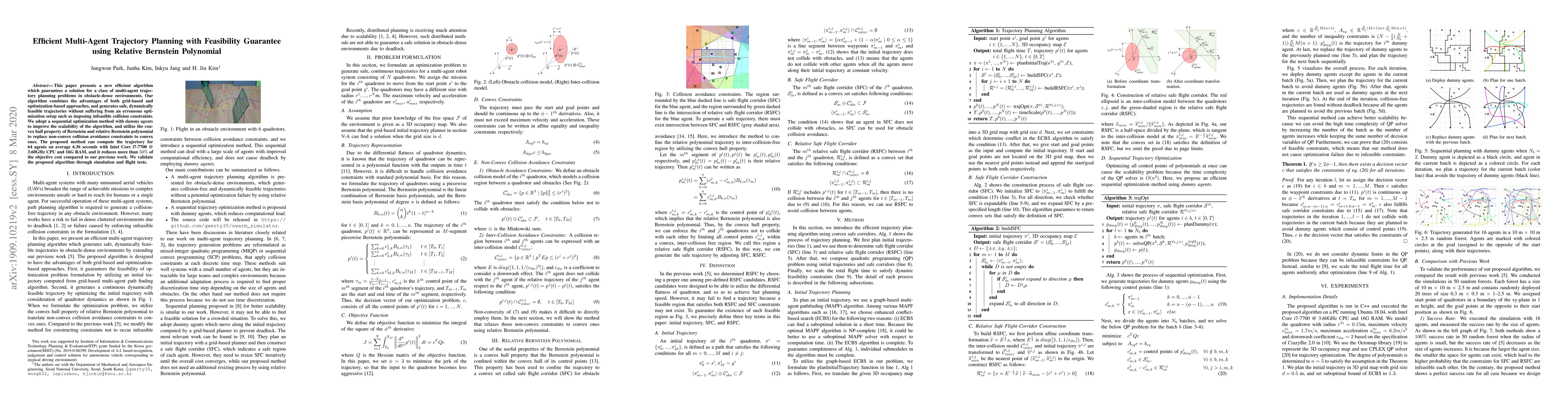 This paper presents a new efficient algorithm which guarantees a solution for a class of multi-agent trajectory planning problems in obstacle-dense environments. Our algorithm combines the advantages of both grid-based and optimization-based approaches, and generates safe, dynamically feasible trajectories without suffering from an erroneous optimization setup such as imposing infeasible collision constraints. We adopt a sequential optimization method with \textit{dummy agents} to improve the scalability of the algorithm, and utilize the convex hull property of Bernstein and relative Bernstein polynomial to replace non-convex collision avoidance constraints to convex ones. The proposed method can compute the trajectory for 64 agents on average 6.36 seconds with Intel Core i7-7700 @ 3.60GHz CPU and 16G RAM, and it reduces more than $50\%$ of the objective cost compared to our previous work. We validate the proposed algorithm through simulation and flight tests.