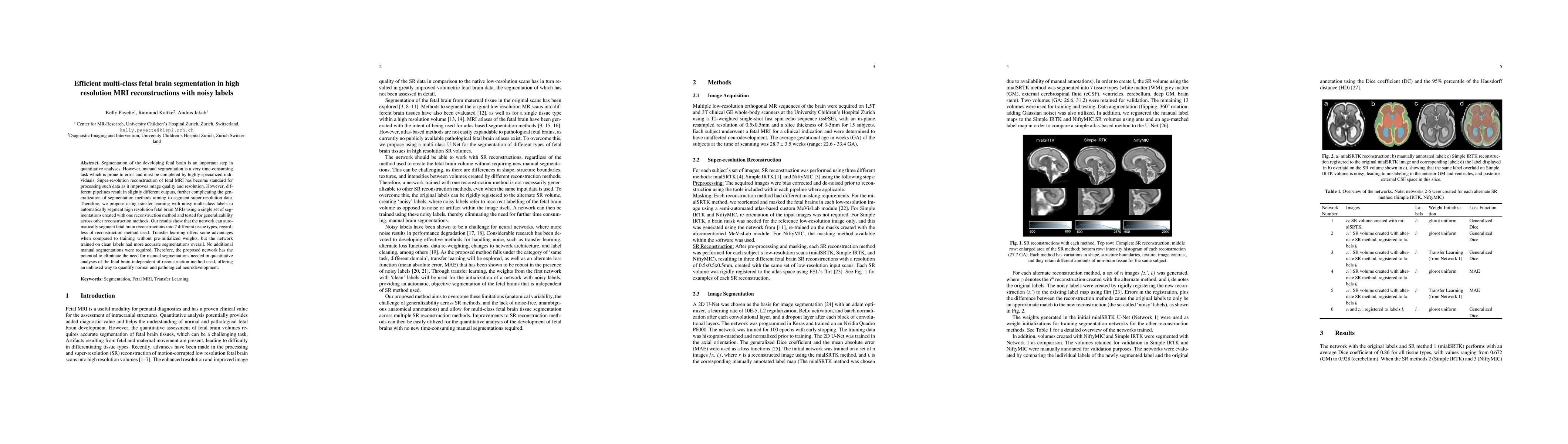 This paper proposes a transfer learning approach to automatically segment high-resolution fetal brain MRIs into seven tissue types using noisy multi-class labels, eliminating the need for manual segmentations. The method demonstrates generalizability across different reconstruction methods, though training on clean labels yielded more accurate results.