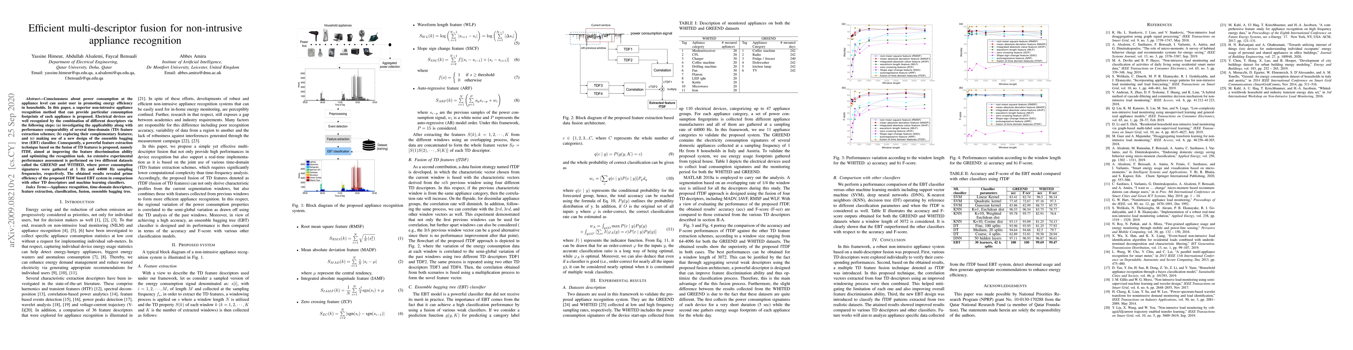 This paper proposes an efficient non-intrusive appliance recognition method using a fusion of time-domain features and an ensemble bagging tree classifier, demonstrating superior performance in identifying and measuring power consumption of household appliances. Experimental results on two datasets show the effectiveness of the proposed fTDF method over other feature extraction techniques and classifiers.