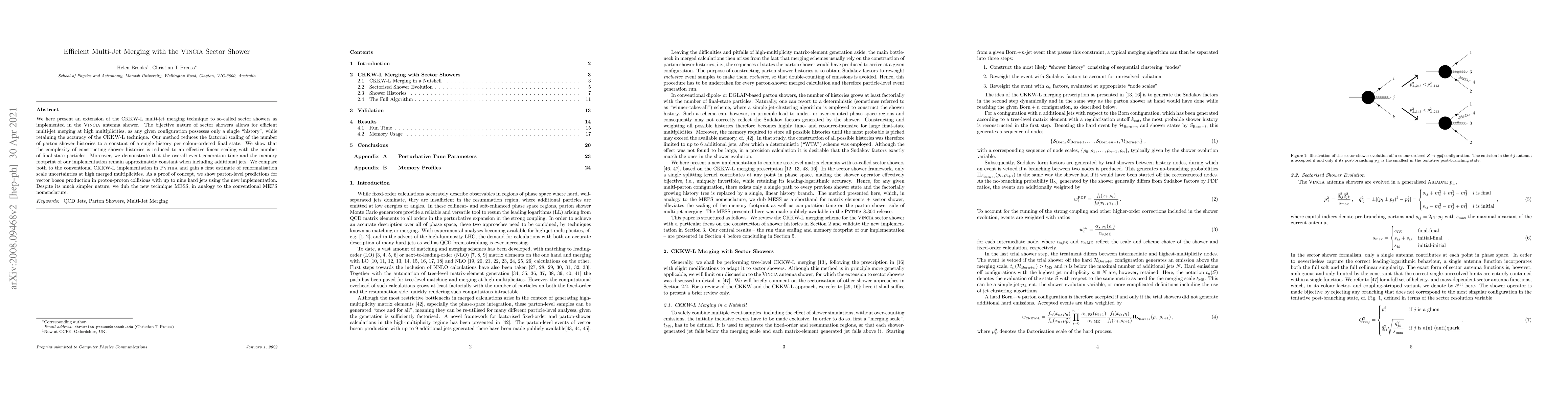 We here present an extension of the CKKW-L multi-jet merging technique to so-called sector showers as implemented in the Vincia antenna shower. The bijective nature of sector showers allows for efficient multi-jet merging at high multiplicities, as any given configuration possesses only a single "history", while retaining the accuracy of the CKKW-L technique. Our method reduces the factorial scaling of the number of parton shower histories to a constant of a single history per colour-ordered final state. We show that the complexity of constructing shower histories is reduced to an effective linear scaling with the number of final-state particles. Moreover, we demonstrate that the overall event generation time and the memory footprint of our implementation remain approximately constant when including additional jets. We compare both to the conventional CKKW-L implementation in Pythia and gain a first estimate of renormalisation scale uncertainties at high merged multiplicities. As a proof of concept, we show parton-level predictions for vector boson production in proton-proton collisions with up to nine hard jets using the new implementation. Despite its much simpler nature, we dub the new technique MESS, in analogy to the conventional MEPS nomenclature.