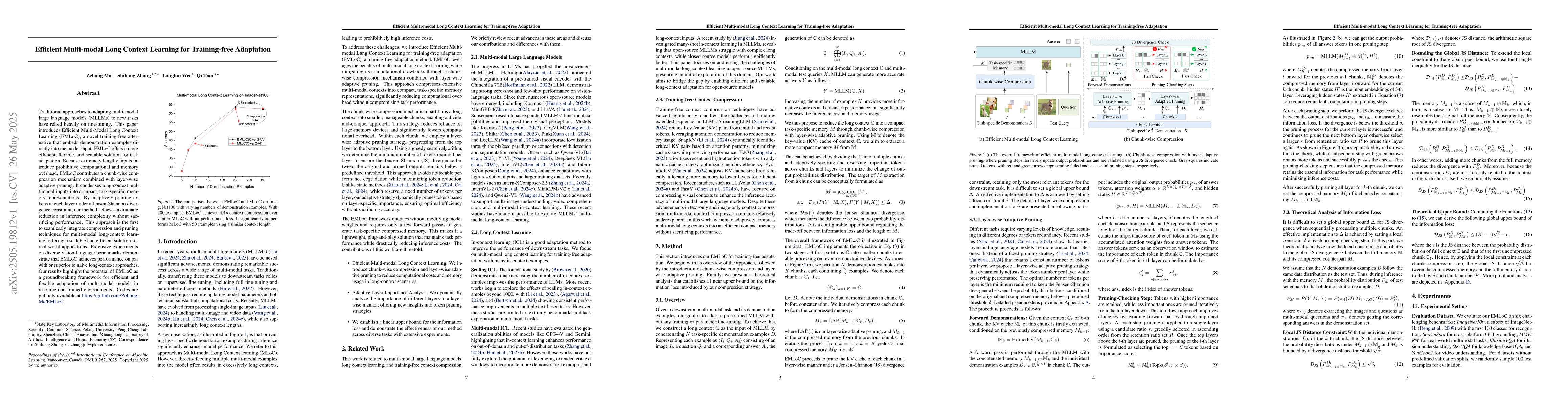 The research introduces Efficient Multi-Modal Long Context Learning (EMLoC), a training-free adaptation method for multi-modal large language models. EMLoC compresses long-context multimodal inputs into compact representations using chunk-wise compression and layer-wise adaptive pruning under Jensen-Shannon divergence constraints.
