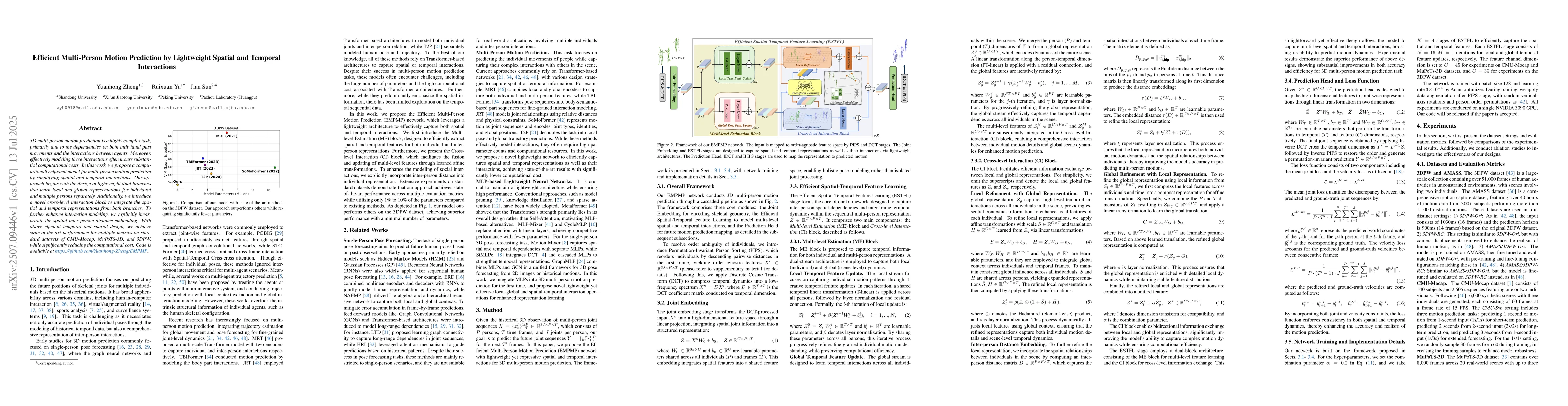 The paper proposes a computationally efficient model for multi-person motion prediction by simplifying spatial and temporal interactions using lightweight dual branches for local and global representations, and a novel cross-level interaction block for integrating spatial and temporal representations.