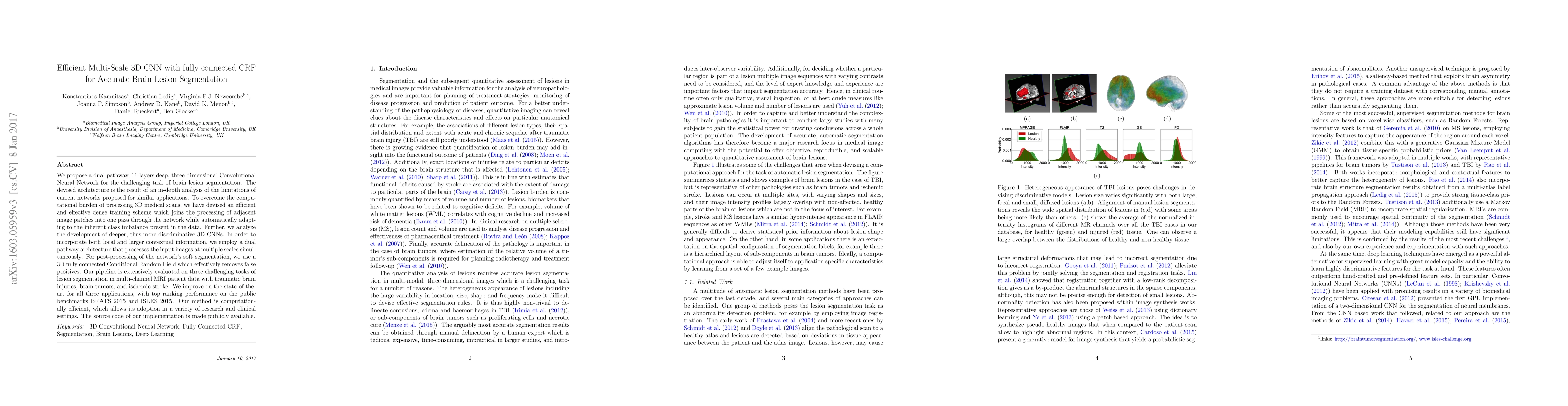 This research introduces an advanced 11-layer 3D CNN with a dual pathway architecture and a fully connected CRF for precise brain lesion segmentation in MRI scans. The proposed method efficiently processes multi-scale 3D medical images, adapting to class imbalance and improving state-of-the-art results on benchmarks for traumatic brain injuries, brain tumors, and ischemic stroke, while remaining computationally efficient.