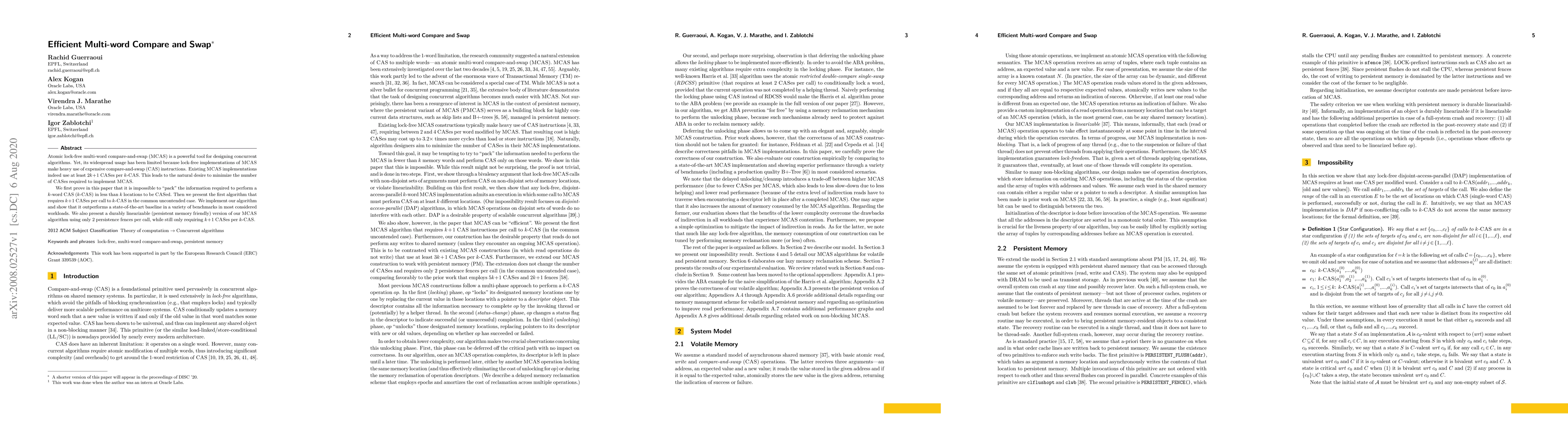 Researchers developed an efficient multi-word compare-and-swap algorithm that requires k+1 CASes per call in the common uncontended case, outperforming existing state-of-the-art baselines in various benchmarks.