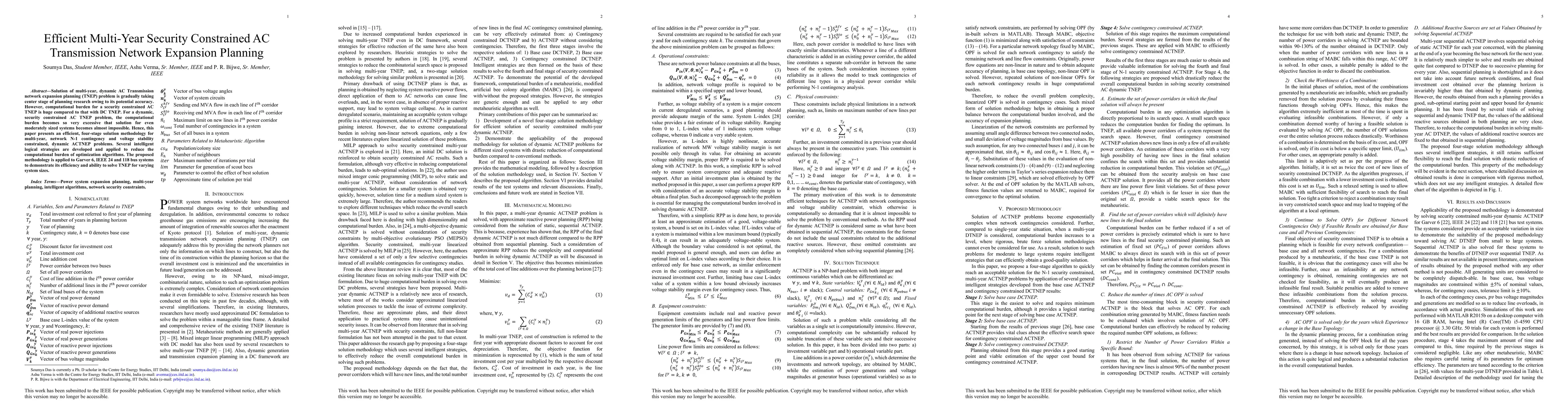 This paper proposes an efficient four-stage solution methodology for multi-year, dynamic, security-constrained AC Transmission Network Expansion Planning (TNEP) problems, addressing the excessive computational burden. The methodology employs intelligent strategies to optimize the planning process, demonstrated through applications on Garver 6, IEEE 24, and 118 bus systems.
