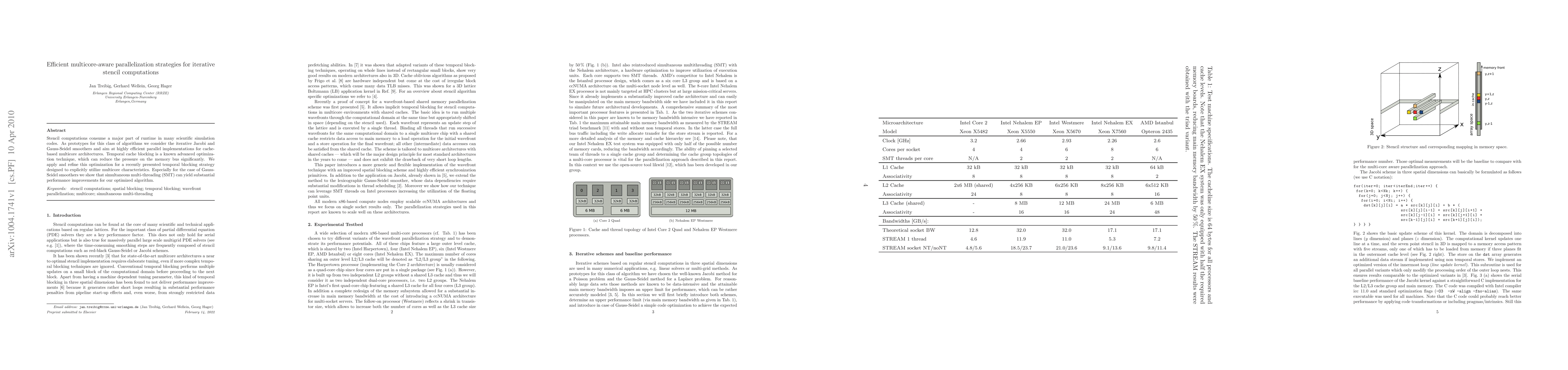 This paper explores efficient parallelization strategies for iterative stencil computations on multicore architectures, focusing on Jacobi and Gauss-Seidel smoothers. It refines temporal cache blocking techniques to optimize performance, demonstrating significant improvements with simultaneous multi-threading for Gauss-Seidel smoothers.