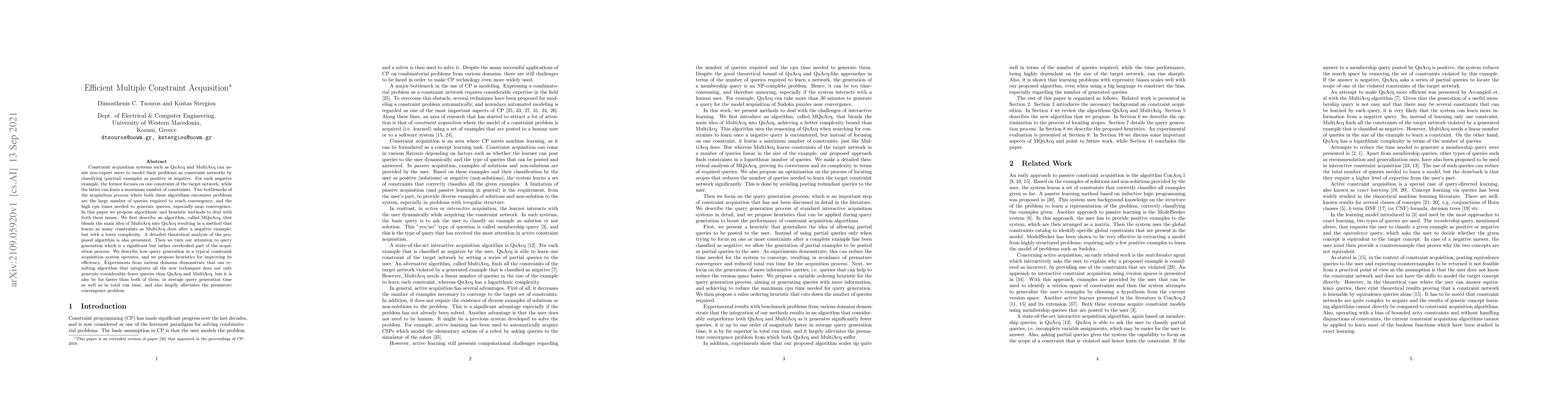 This paper proposes MQuAcq, an algorithm that combines the strengths of QuAcq and MultiAcq, to efficiently acquire multiple constraints while reducing query complexity and CPU time. Additionally, it introduces heuristics for improving query generation efficiency, demonstrating significant reductions in query numbers and overall runtime compared to existing methods.