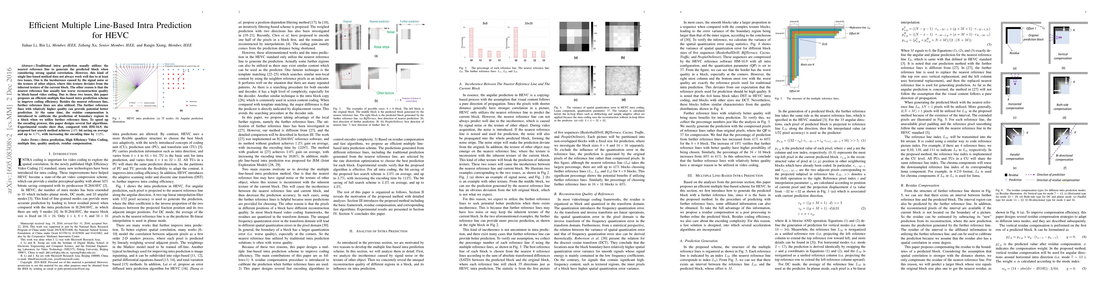 Traditional intra prediction usually utilizes the nearest reference line to generate the predicted block when considering strong spatial correlation. However, this kind of single line-based method does not always work well due to at least two issues. One is the incoherence caused by the signal noise or the texture of other object, where this texture deviates from the inherent texture of the current block. The other reason is that the nearest reference line usually has worse reconstruction quality in block-based video coding. Due to these two issues, this paper proposes an efficient multiple line-based intra prediction scheme to improve coding efficiency. Besides the nearest reference line, further reference lines are also utilized. The further reference lines with relatively higher quality can provide potential better prediction. At the same time, the residue compensation is introduced to calibrate the prediction of boundary regions in a block when we utilize further reference lines. To speed up the encoding process, this paper designs several fast algorithms. Experimental results show that, compared with HM-16.9, the proposed fast search method achieves 2.0% bit saving on average and up to 3.7%, with increasing the encoding time by 112%.