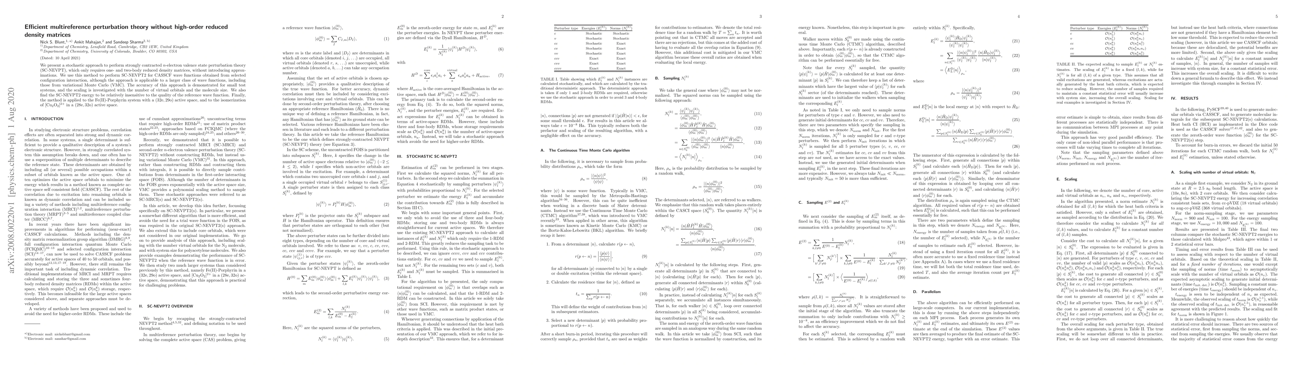 This paper introduces a stochastic method for efficient multireference perturbation theory (SC-NEVPT2) that avoids high-order reduced density matrices, relying only on one- and two-body matrices. The approach is demonstrated to be accurate and scalable for small test systems and applied to complex systems like Fe(II)-Porphyrin and Cu2O2 isomerization.
