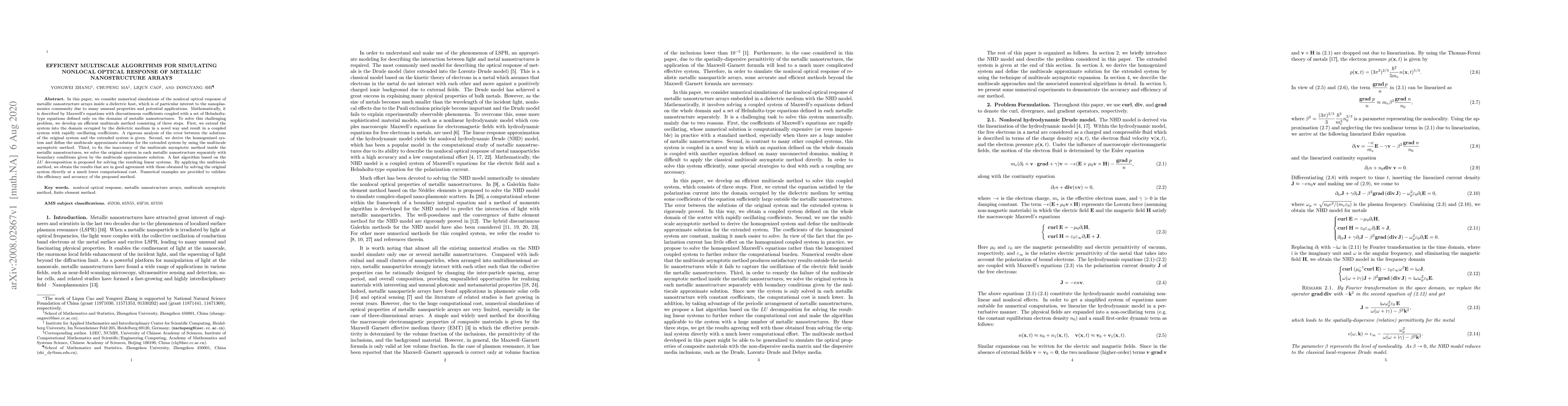 This paper develops an efficient multiscale algorithm to simulate the nonlocal optical response of metallic nanostructure arrays within a dielectric host, addressing the complex interactions described by Maxwell's equations. The proposed method combines homogenization, multiscale asymptotic analysis, and localized boundary condition solutions to achieve accurate results at a significantly reduced computational cost.
