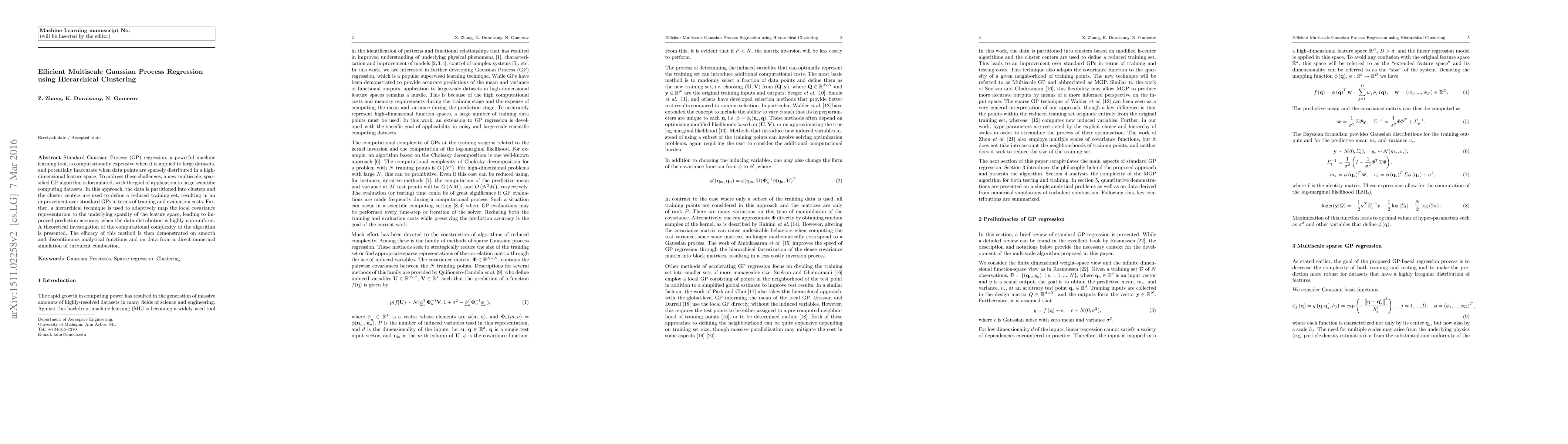 The paper proposes an efficient multiscale Gaussian Process regression method using hierarchical clustering to tackle computational expense and inaccuracy in large, sparse datasets. This technique partitions data into clusters, uses centers as a reduced training set, and adaptively maps local covariance to feature space sparsity, improving both prediction accuracy and computational efficiency. The method's effectiveness is validated on analytical functions and turbulent combustion simulation data.