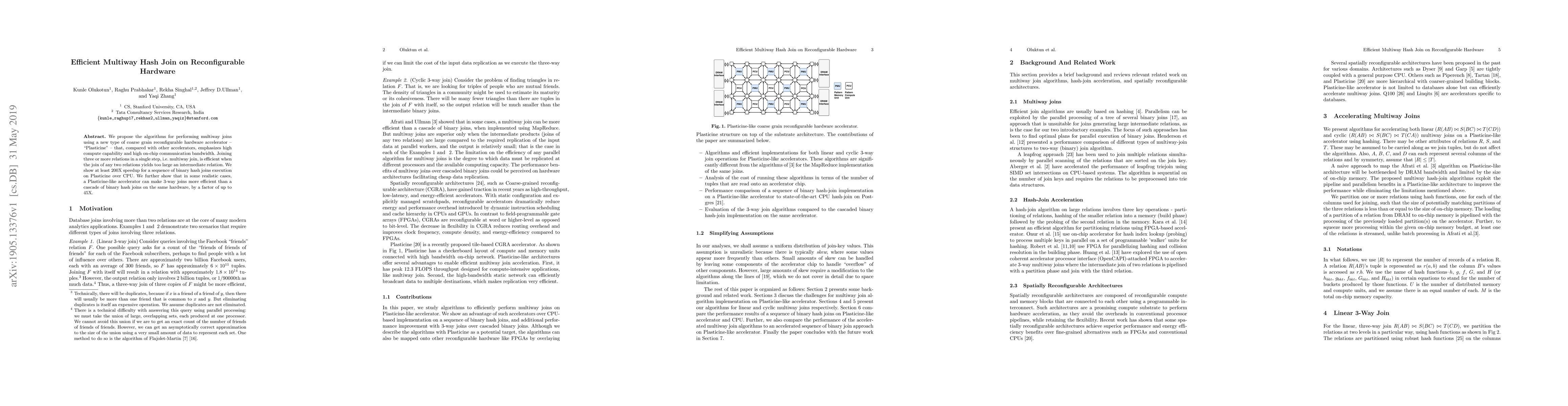 This paper introduces algorithms for efficient multiway hash joins on a new reconfigurable hardware accelerator called Plasticine, showcasing significant speedups over CPU-based binary hash joins and demonstrating that it can make 3-way joins up to 45X more efficient in some cases. The Plasticine accelerator emphasizes high compute capability and communication bandwidth.