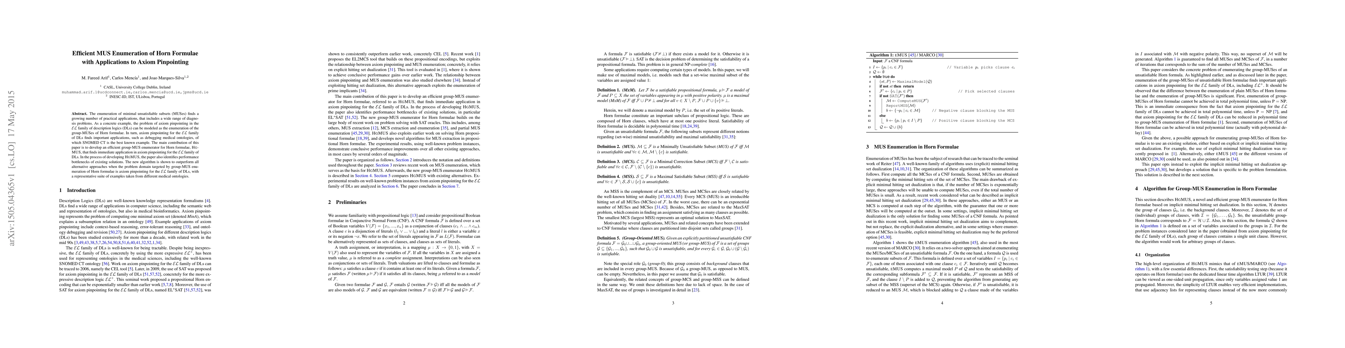 This paper presents an efficient algorithm, HGMUS, for enumerating minimal unsatisfiable subsets (MUSes) of Horn formulae, significantly improving performance over existing methods. The algorithm is particularly effective for axiom pinpointing in the EL family of description logics, with applications in debugging medical ontologies like SNOMED CT.