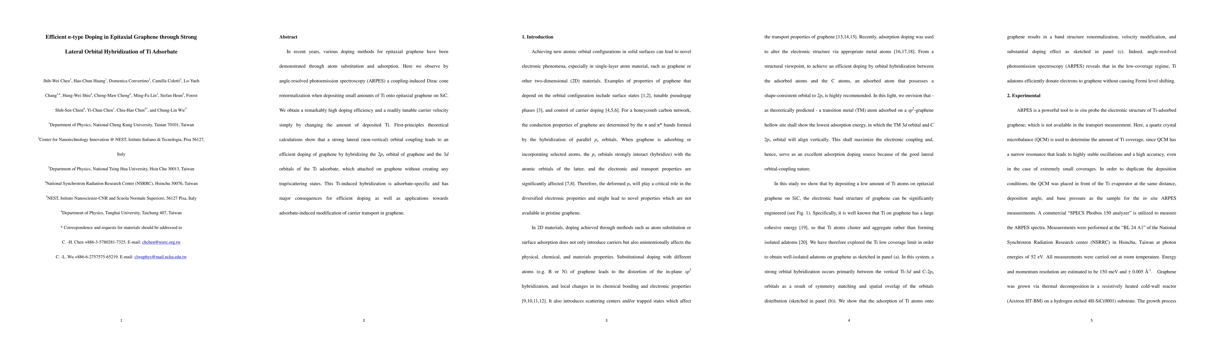 This paper demonstrates efficient n-type doping in epitaxial graphene via strong lateral orbital hybridization of Ti adatoms, achieving high doping efficiency and tunable carrier velocity. Theoretical calculations reveal that this doping mechanism involves hybridization between graphene's 2pz orbital and Ti's 3d orbitals, without creating scattering states.