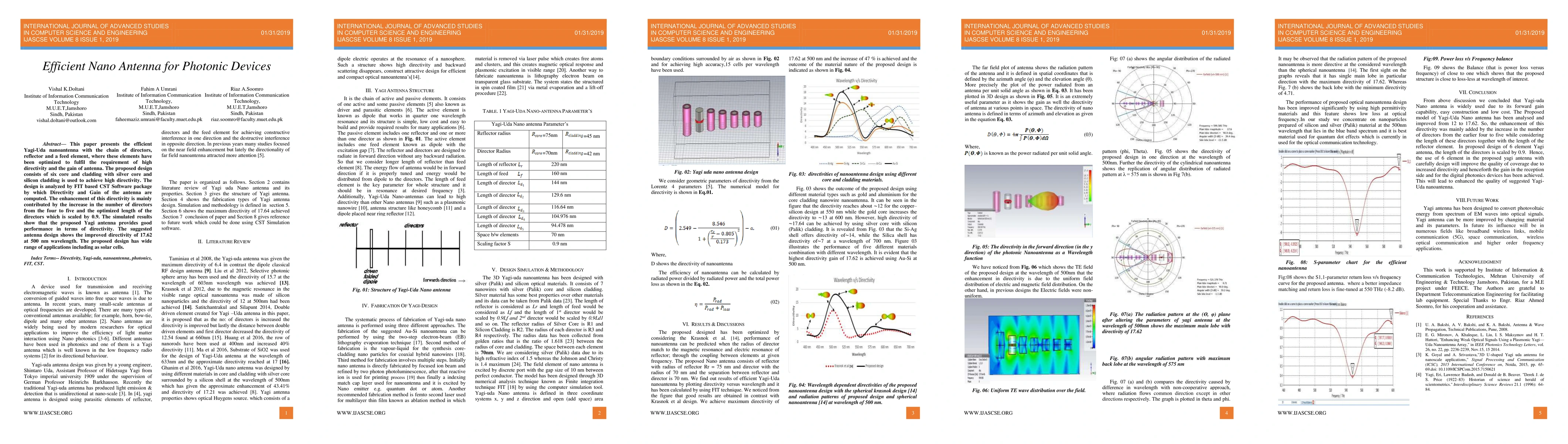 This paper presents the efficient Yagi-Uda nanoantenna with the chain of directors, reflector and a feed element, where these elements have been optimized to fulfil the requirement of high directivity and the gain of antenna. The proposed design consists of six core and cladding with silver core and silicon cladding is used to achieve high directivity. The design is analyzed by FIT based CST Software package by which Directivity and Gain of the antenna are computed. The enhancement of this directivity is mainly contributed by the increase in the number of directors from the four to five and the optimized length of the directors which is scaled by 0.9. The simulated results show that the proposed Yagi antenna provides good performance in terms of directivity. The suggested antenna design shows the improved directivity of 17.62 at 500 nm wavelength. The proposed design has wide range of applications including as solar cells.