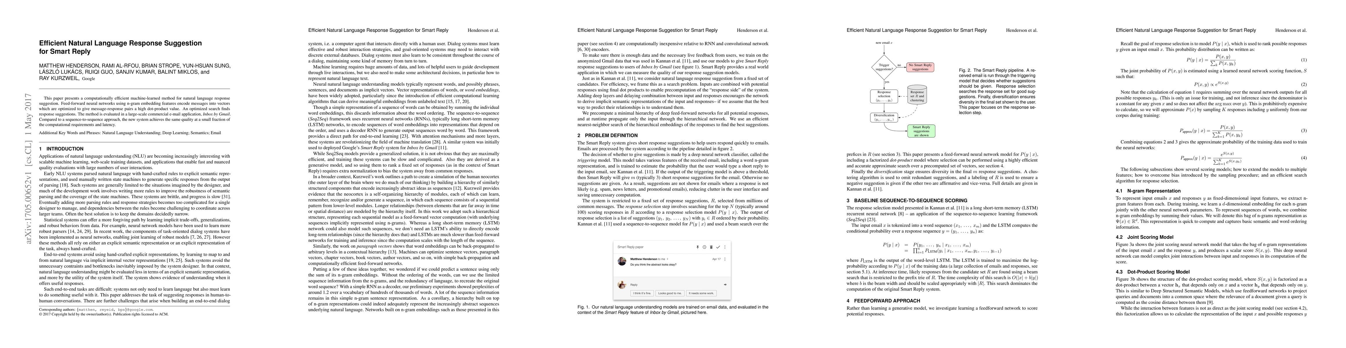 This paper presents a computationally efficient machine-learned method for natural language response suggestion. Feed-forward neural networks using n-gram embedding features encode messages into vectors which are optimized to give message-response pairs a high dot-product value. An optimized search finds response suggestions. The method is evaluated in a large-scale commercial e-mail application, Inbox by Gmail. Compared to a sequence-to-sequence approach, the new system achieves the same quality at a small fraction of the computational requirements and latency.