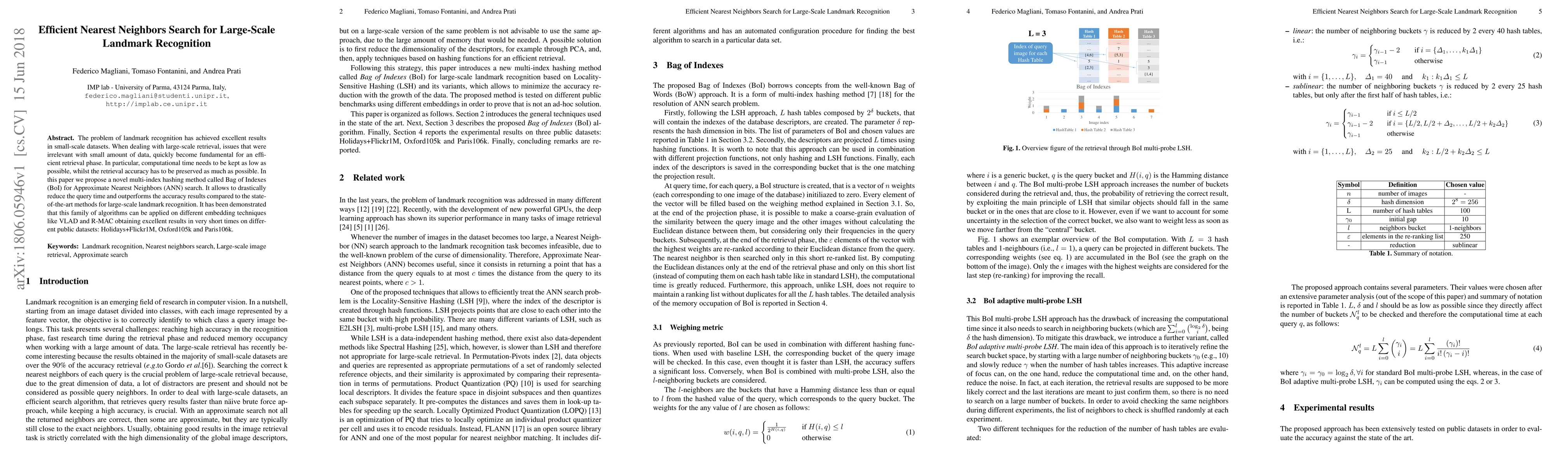 A novel multi-index hashing method called Bag of Indexes (BoI) is proposed for efficient Approximate Nearest Neighbors search in large-scale landmark recognition, achieving improved query times and accuracy over state-of-the-art methods.